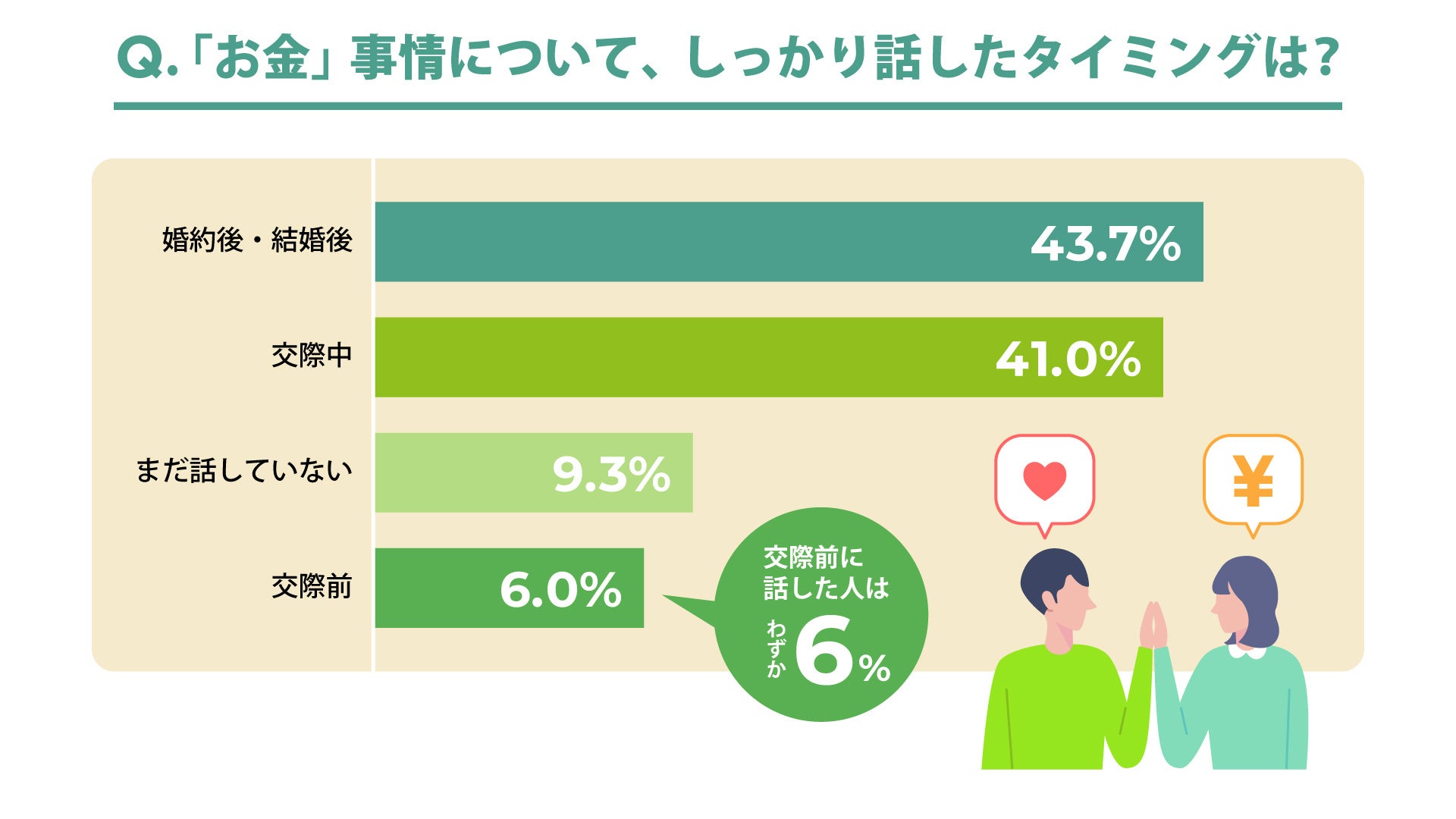 『お相手のお金事情について話し合ったタイミング』を尋ねたところ、『婚約後・結婚後』が43.7%、『交際中』が41.0%、『交際前』がわずか6.0%であることが判明。相手選びで重要な要素であるにも関わらず、お金事情については結婚を決めた婚約後に話した人が多いことが明らかになった。