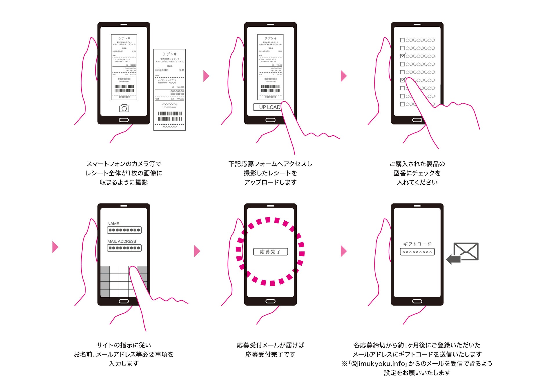 対象となるレシートの情報(購入日、購入製品、店舗、購入金額)が分かるように撮影し、画像をWEB応募フォームから送信してください。