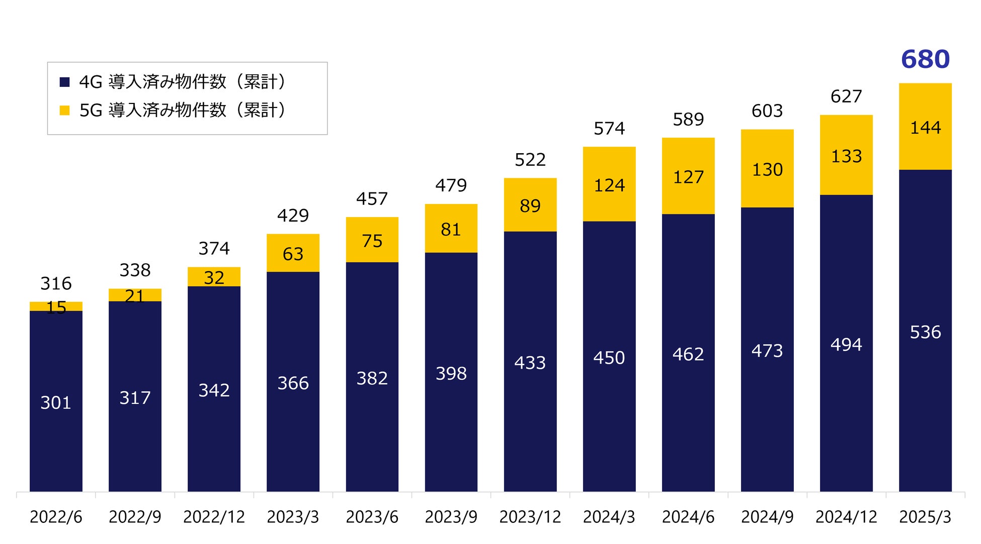 2025年3月時点の累計導入済物件数(4G/5G、国内)は680件(前年同期比118%)となりました。