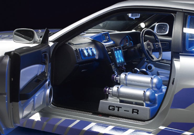 ニトロ噴射装置、アンビエントライトなど、インテリアは細部に至るまで劇中モデルをリアルに再現しています。