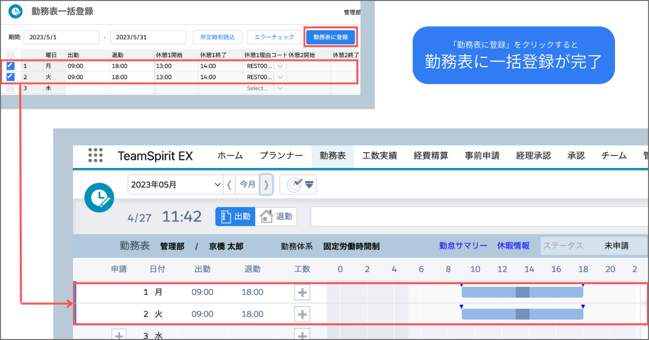 (※)「TeamSpirit」の「勤務表一括登録機能」を使うことで、工場や派遣先、遠隔地勤務等でシステムによる打刻ができない従業員の所定勤務時時間を一括で登録・管理することが可能です。