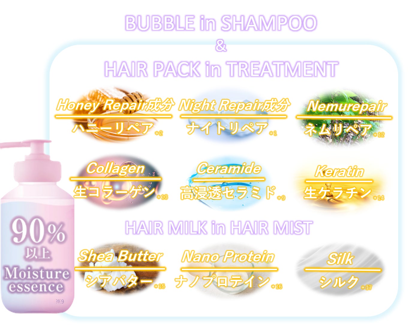 『ナノバブルパーツ採用のバブルinシャンプー』『ナイトカプセル*4配合のヘアパックinトリートメント』『用途に合わせて剤形を選択できる2Way式ヘアミルクinヘアミスト』をラインナップしました。