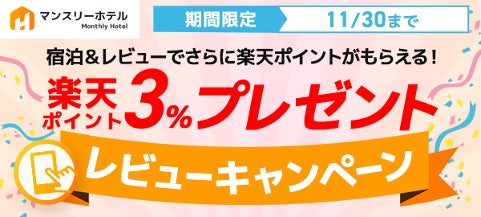 2022年10月6日(木)~11月30日(水)中にレビューをご投稿いただいた方全員に、宿泊料金の3%を楽天ポイントで還元いたします。マンスリーホテルは通常時のご予約においてもご利用ホテルに応じて2%~4%の楽天ポイントを付与しており、キャンペーンと組み合わせることで最大7%のポイントが還元されます。
