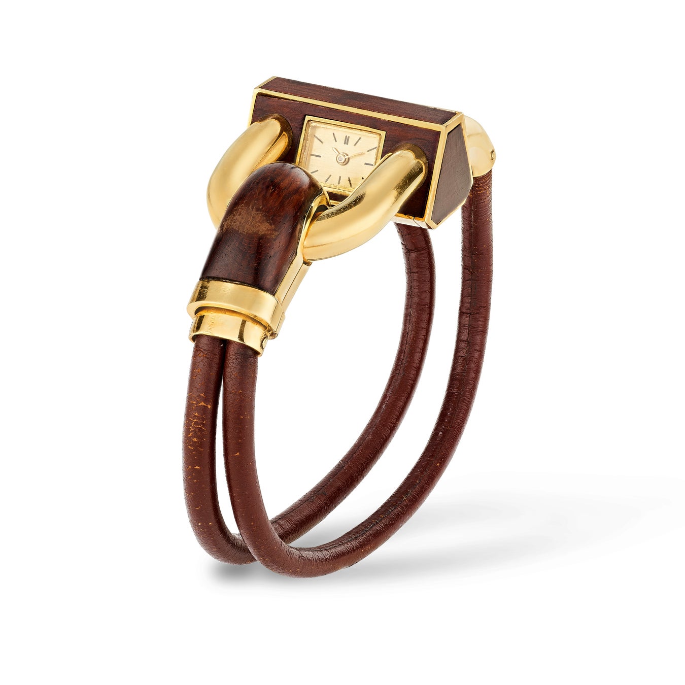 カデナ ウォッチは、メゾンを代表する作品の中でもとりわけ重要な位置を占めています。1935 年に初めてイエローゴールドで制作されて以来、数多くのカラーバリエーションで展開されてきました。特に注目すべきは、1936 年12 月、ケース上部側面とクラスプの裏側にキャリブルカット サファイアもしくはルビーを1 列あしらったモデルが登場したことです。1938 年にダイヤモンドが1943 年にエメラルドが追加され、カラーチャートがさらに充実しました。この作品はまた、プラチナのスネークチェーンに、パヴェセッティングのブリリアントカット ダイヤモンドと、一列に並べたバゲットカット ダイヤモンドを組み合わせることで、ホワイトジュエリーの流行にも対応しています。さらに、日常的に着用できるように再解釈され、レザーブレスレットを合わせたモデルも提案されています。