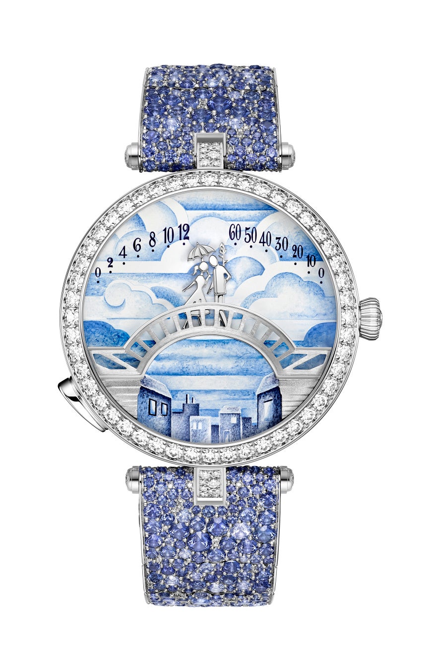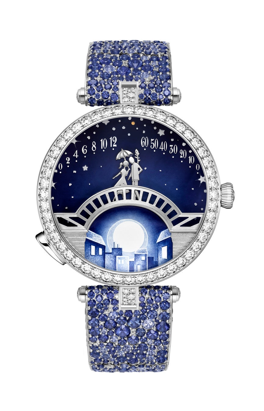 2010 年、ヴァン クリーフ&アーペルは、ポンデ ザムルー ウォッチを発表し、ポエティック コンプリケーションとしては初めてジュネーブウォッチ グランプリを受賞しました。以来このコレクションでは、愛する想いで結ばれた男女がパリの橋の上で出会うというストーリーを紡いできました。ダブルレトログラード ムーブメントがそれぞれ時と分を刻むにつれ、恋人たちは徐々に歩み寄り、正午と真夜中に口づけを交わします。時が止まったかのように感じられる3 分間が過ぎると、ふたりが離れていき、新たに時と分を示します。