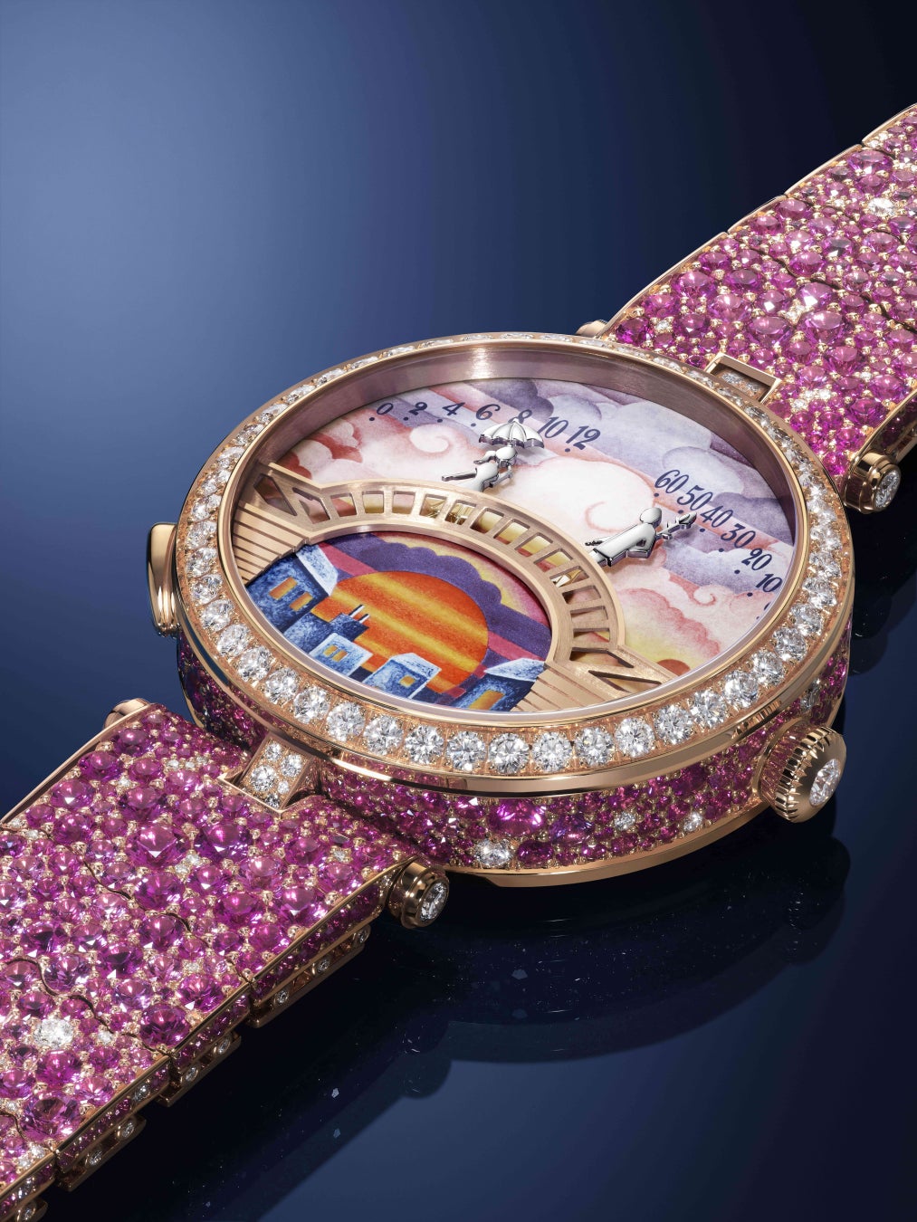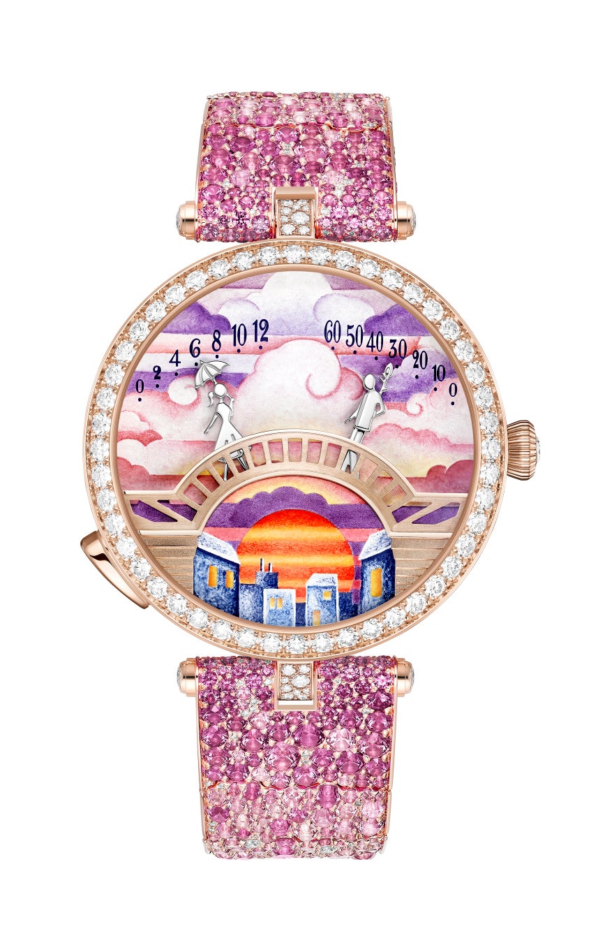 この詩情溢れる瞬間を思いのままに体験できるよう、オンデマンド アニメーション モジュールにより、12 秒間このシーンを再生することが可能です。今年は、贅沢なブレスレットを備えた4 つの新作ウォッチが、1 日のさまざまな時間帯を想起させる風景の中に恋人たちを浮かび上がらせ、愛の物語をさらに豊かに描き出します。文字盤はそれぞれ、夜明け、朝、夕暮れ、月明かりのカラーニュアンスを