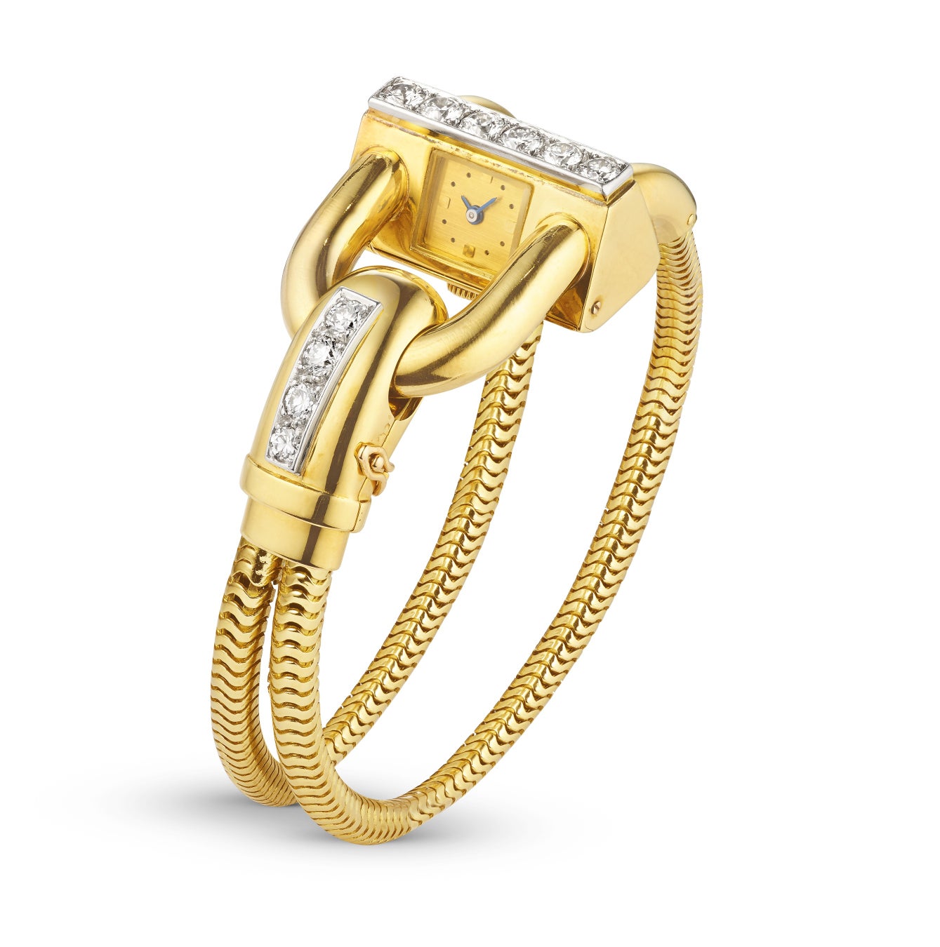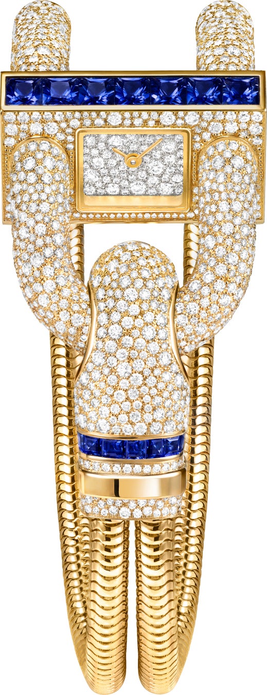 この新作では、イエローゴールドのブレスレットに、ダイヤモンドをスノーセッティングで敷き詰めたケースを組み合わせ、一列に並んだプリンセスカット サファイアで引き立てています。この輝きに満ちたカラーコンビネーションは、スクエアカット サファイアのラインで飾られたクラスプでも繰り返されています。ホワイトゴールドの文字盤もまたダイヤモンドの輝きを纏っています。