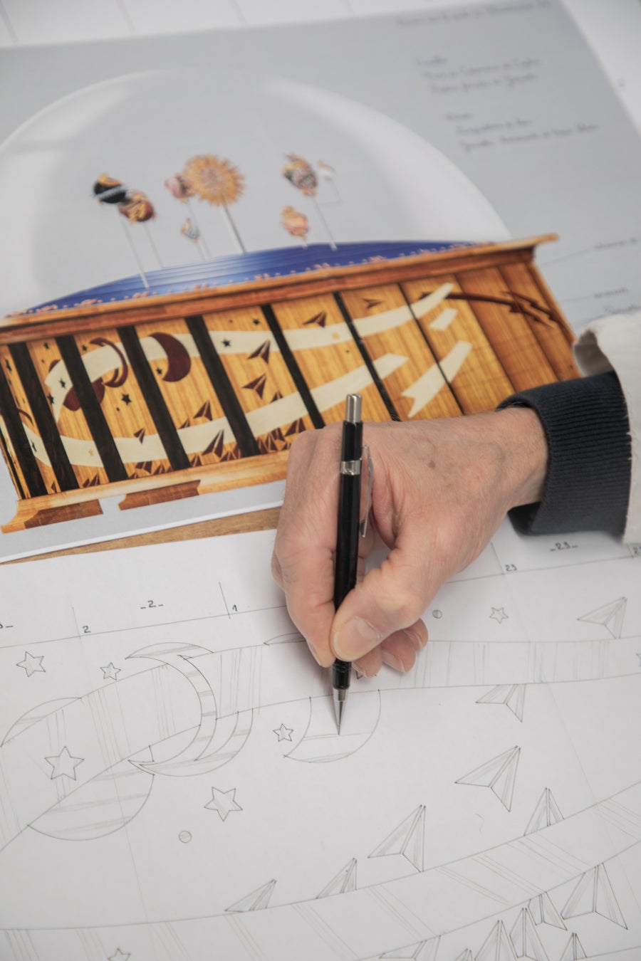 こうした魅惑的な装飾を生み出しているのが、グリザイユ エナメルです。この技法により、幅広い色調が繊細な水彩画のように生き生きと表現されています。前景には橋のシルエットがゴールドで精巧に彫刻され、風景から浮かび上がることで遠近感をもたらしています。物語はケースバックへと続き、サファイアガラスに施されたエナメル デカールとゴールド エングレービングの技法によって表現されてい