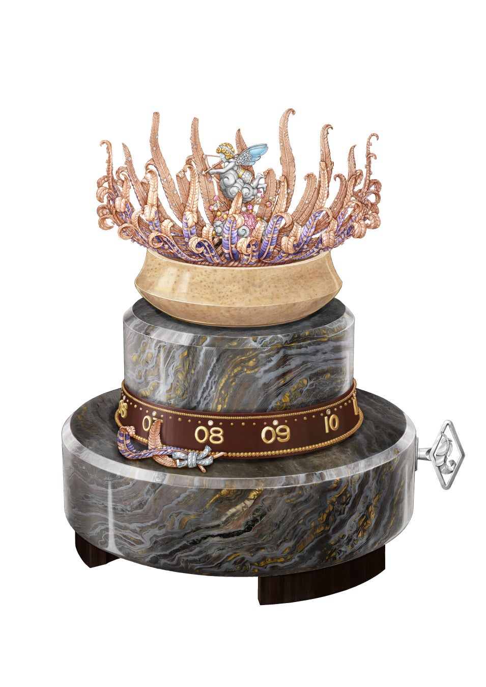 オートマタの土台は、ゴールドのハイライトが縞模様を織りなす石、アイアンアイで構成され、全体に彫刻が施されています。メゾンの作品に新たに採用されたパームウッドの化石でできたボウルが、羽のバスケットを支えています。こうした素材は、メゾンの専門家によって厳選され、さらにカットとポリッシュを施されることで、それぞれの個性や独自性が一層際立ちます。目盛り入りのリングが回転し、ダイヤモンドでアクセントをつけたラッカー仕上げの2 枚の羽によって時刻を示します。この羽は、ダイヤモンドが全面に敷き詰められたリボンで固定されています。