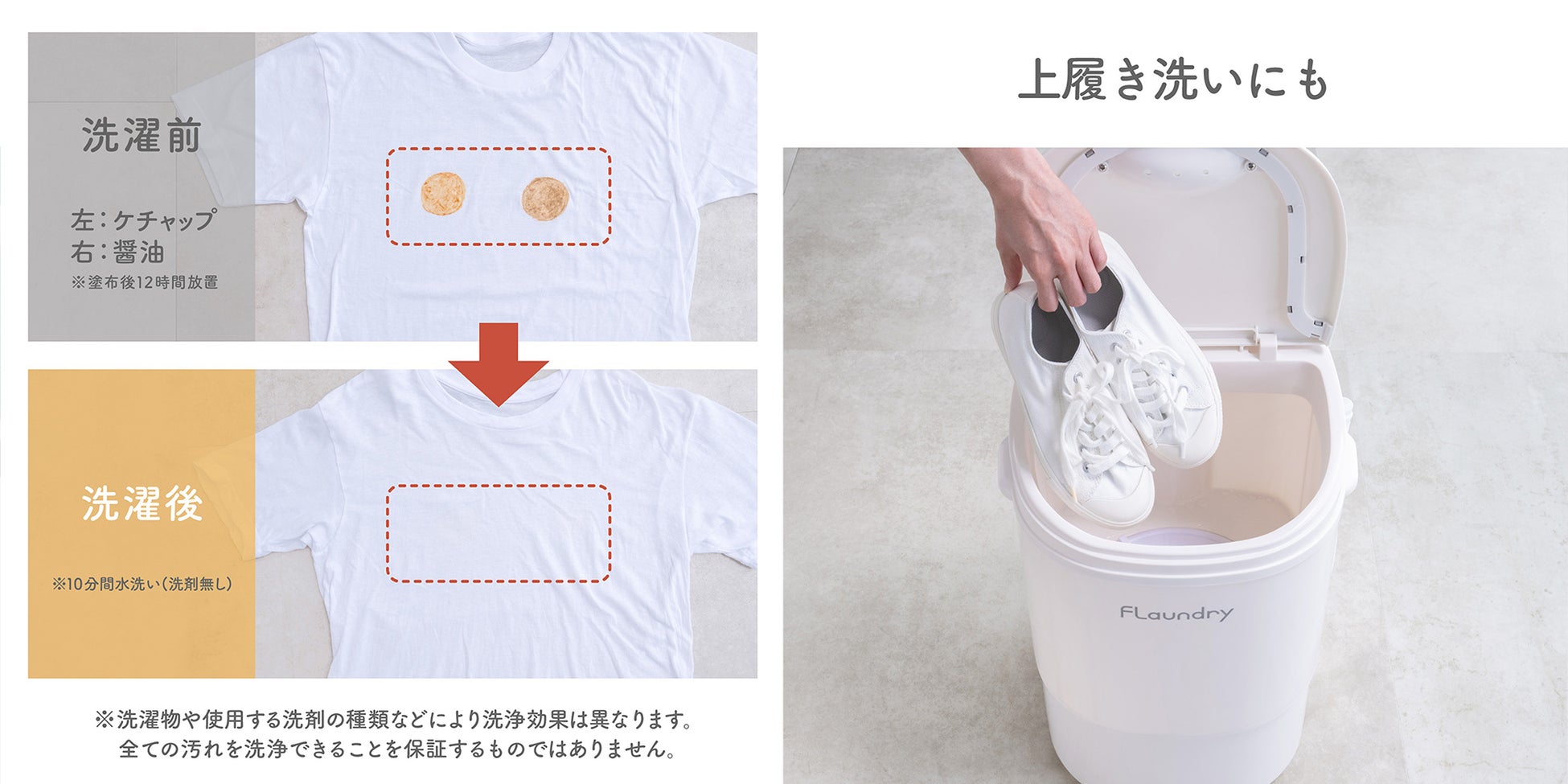 ※2 当社調べ(洗浄力実験による。洗濯条件:綿100%Tシャツにケチャップ・醤油を付着後12時間放置し乾燥。最大水量、洗剤なしで10分間洗濯後の汚れ落ちを目視で確認)