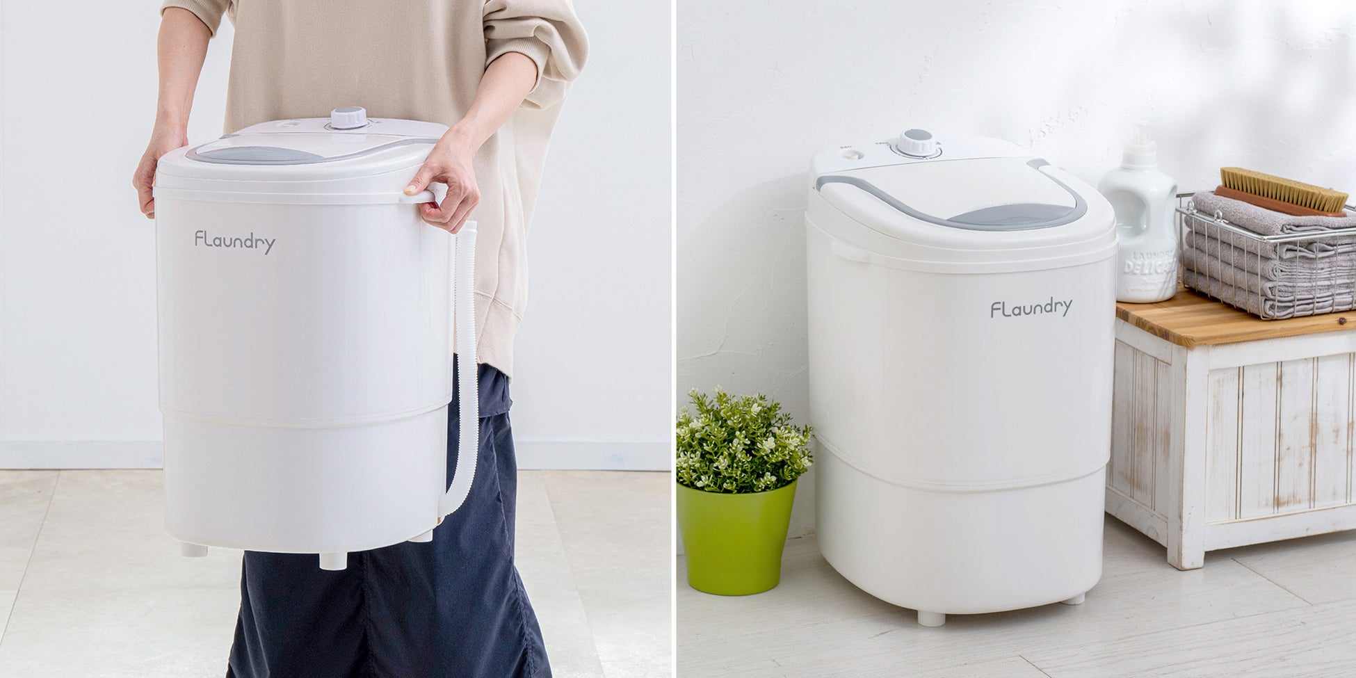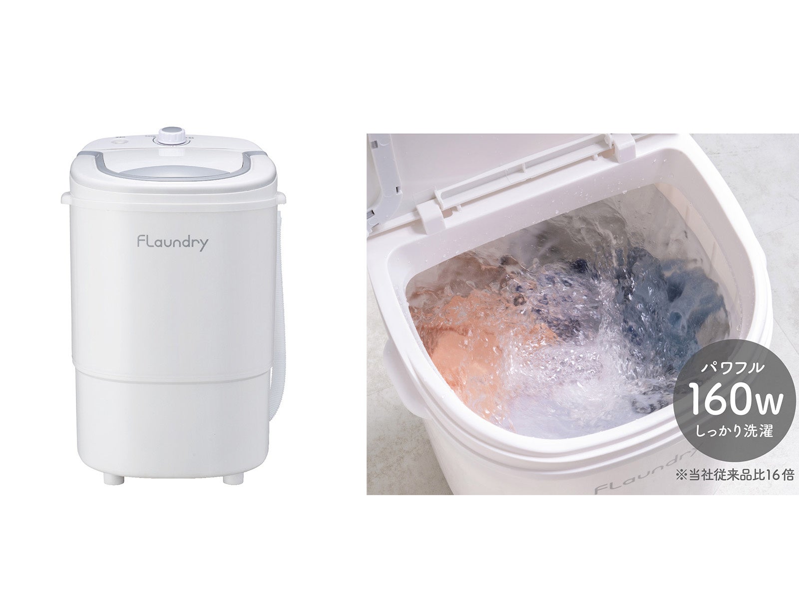 『フランドリー・しっかり洗える小型洗濯機』は、小型洗濯機でありながら洗濯・すすぎ・脱水・排水の機能を備えています。北欧風デザインのコンパクトボディは3kgの洗濯に対応し、16倍パワフルな水流※1によって約10分で洗濯物の汚れを落とします。※2