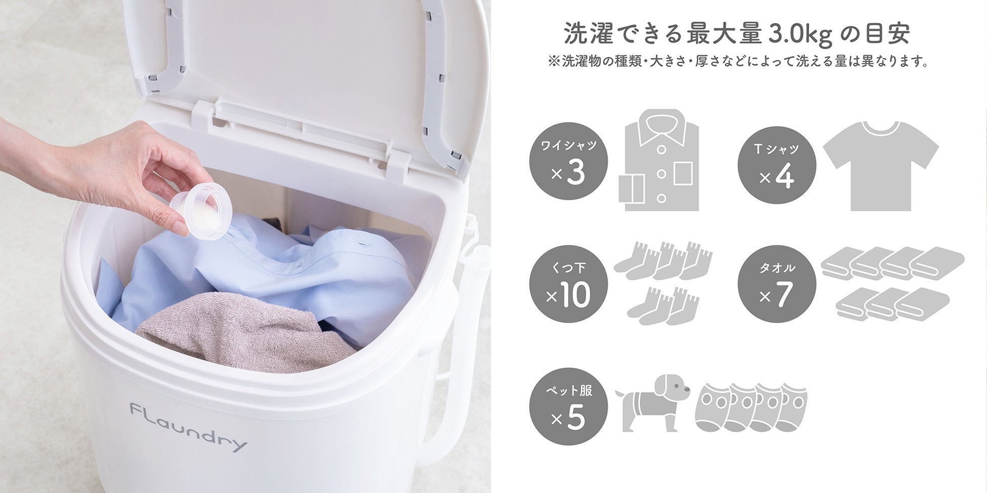 洗濯容量は約3kgで、シャツなら4枚、タオルなら7枚洗えるのでまとめ洗いにも対応します。