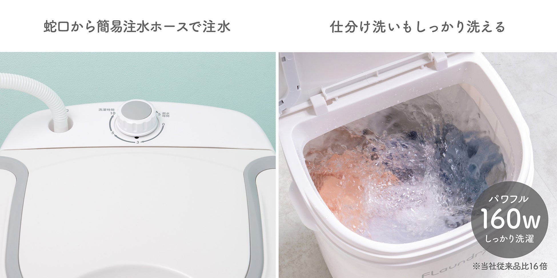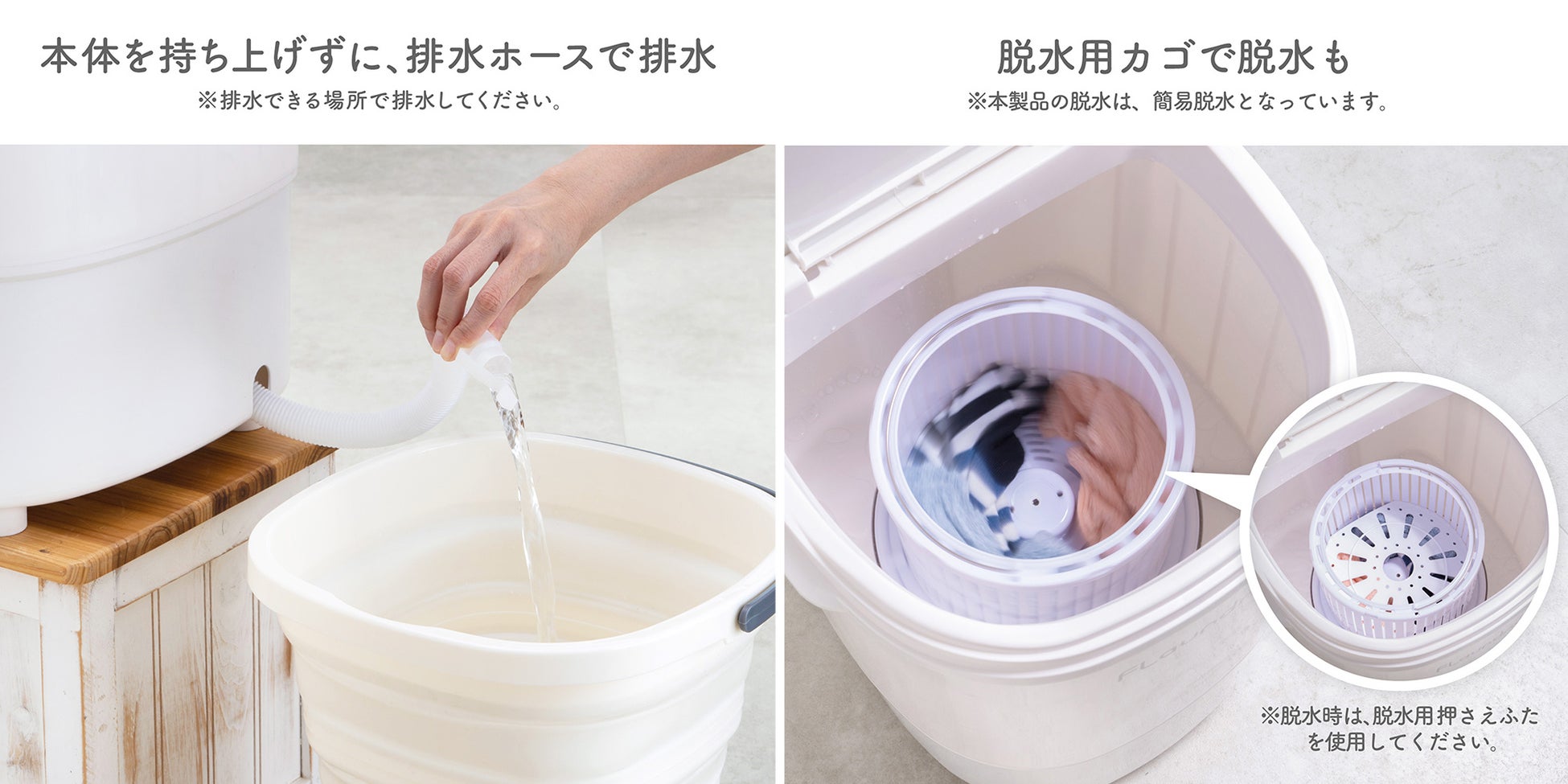 ~ 洗濯・脱水の2モード簡単操作、排水ホースで楽に排水、どこでも持ち運び自由 ~
