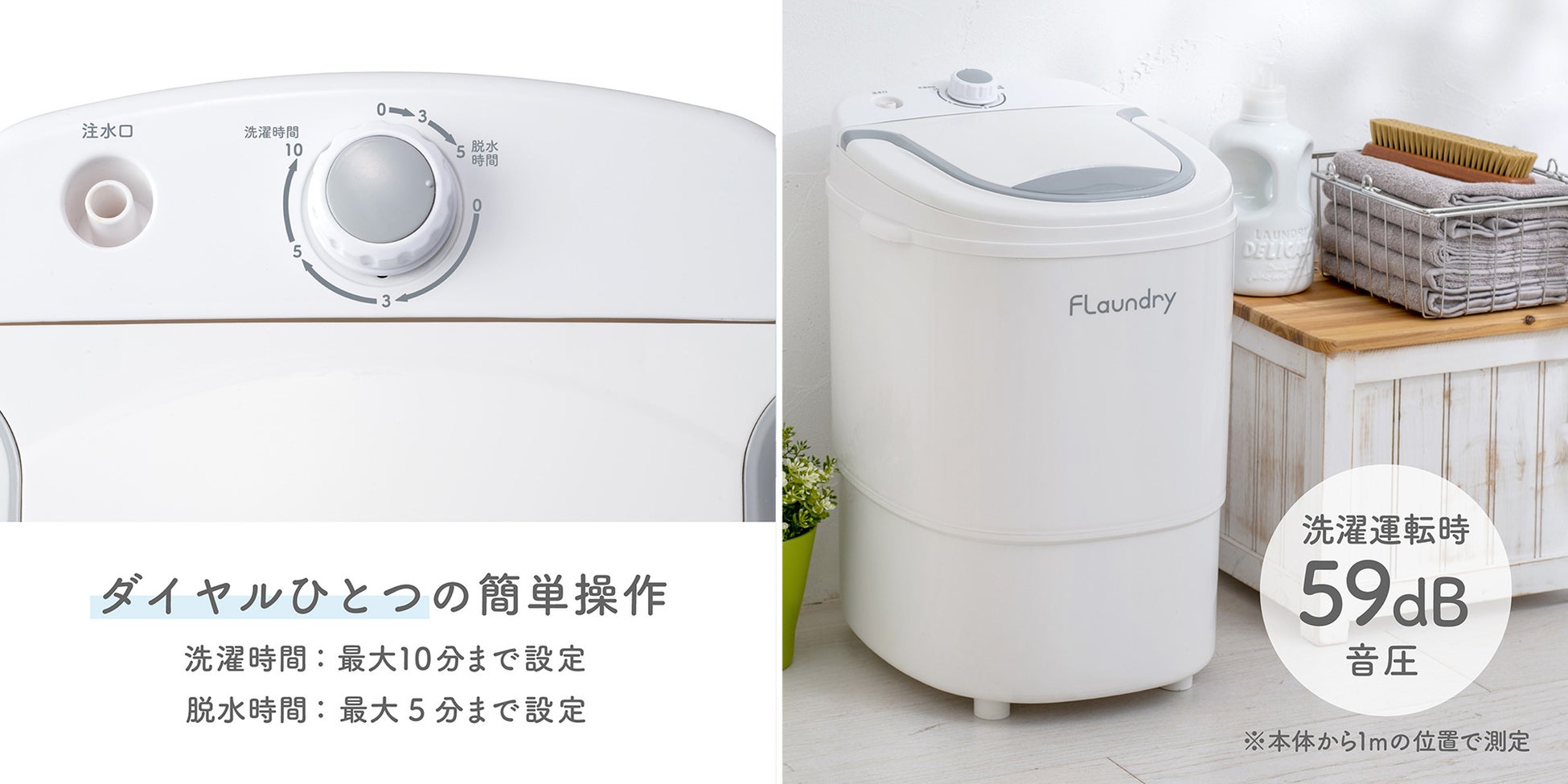 ダイヤルの簡単操作で洗濯時間は最大10分まで、脱水時間は最大5分まで設定することができます。