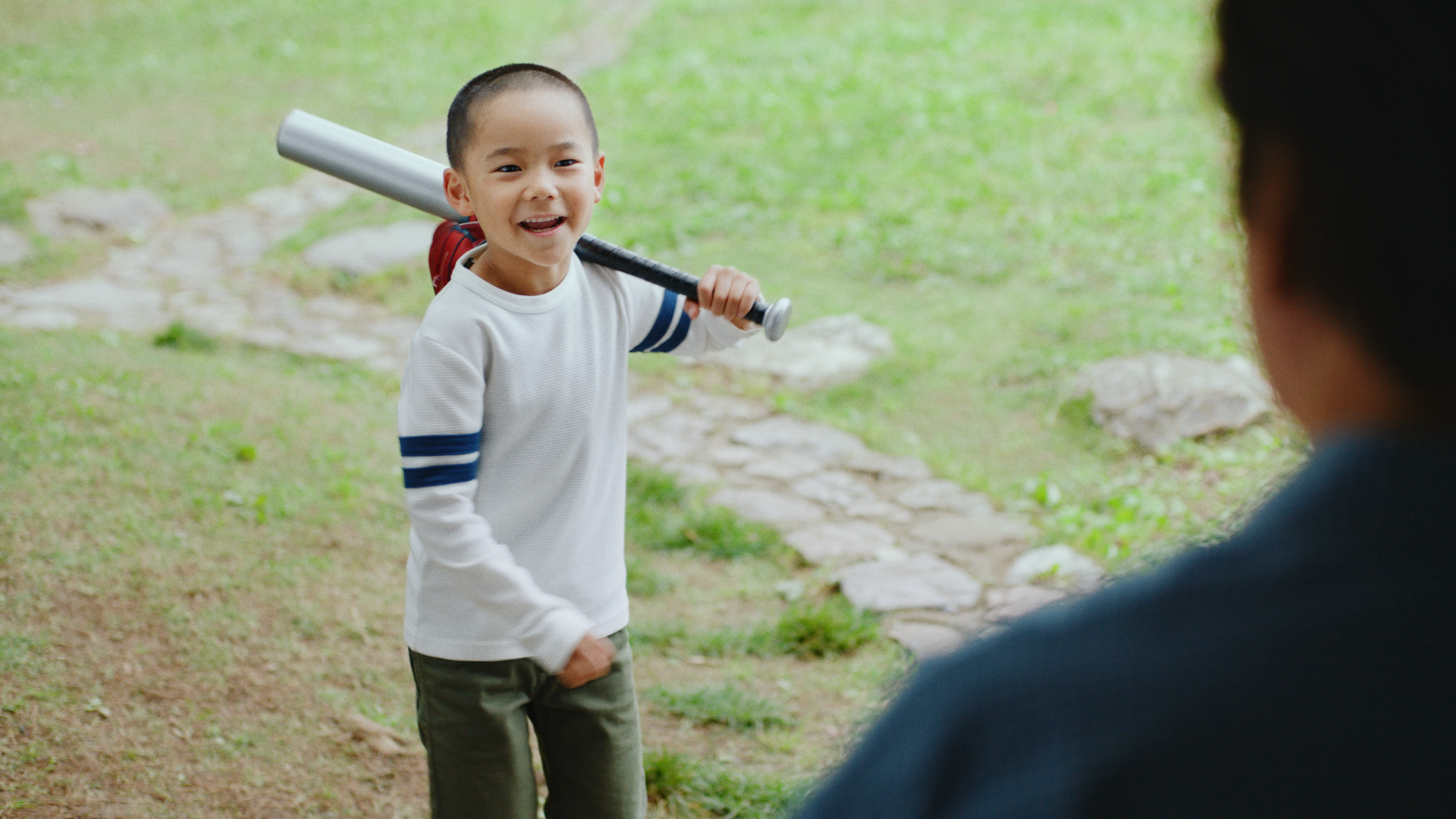 草刈正雄さん演じる祖父のもとに「じーじ、野球しよう!」と遊びに来た孫(役・番家玖太くん)。「人生いつでも、真剣勝負」と意気込んでボールを投げる祖父ですが、孫は見事に打ち返し、祖父は孫の成長を感じます。