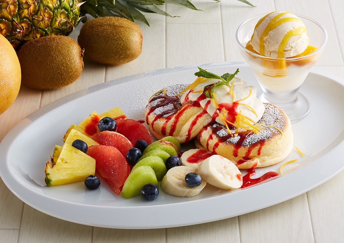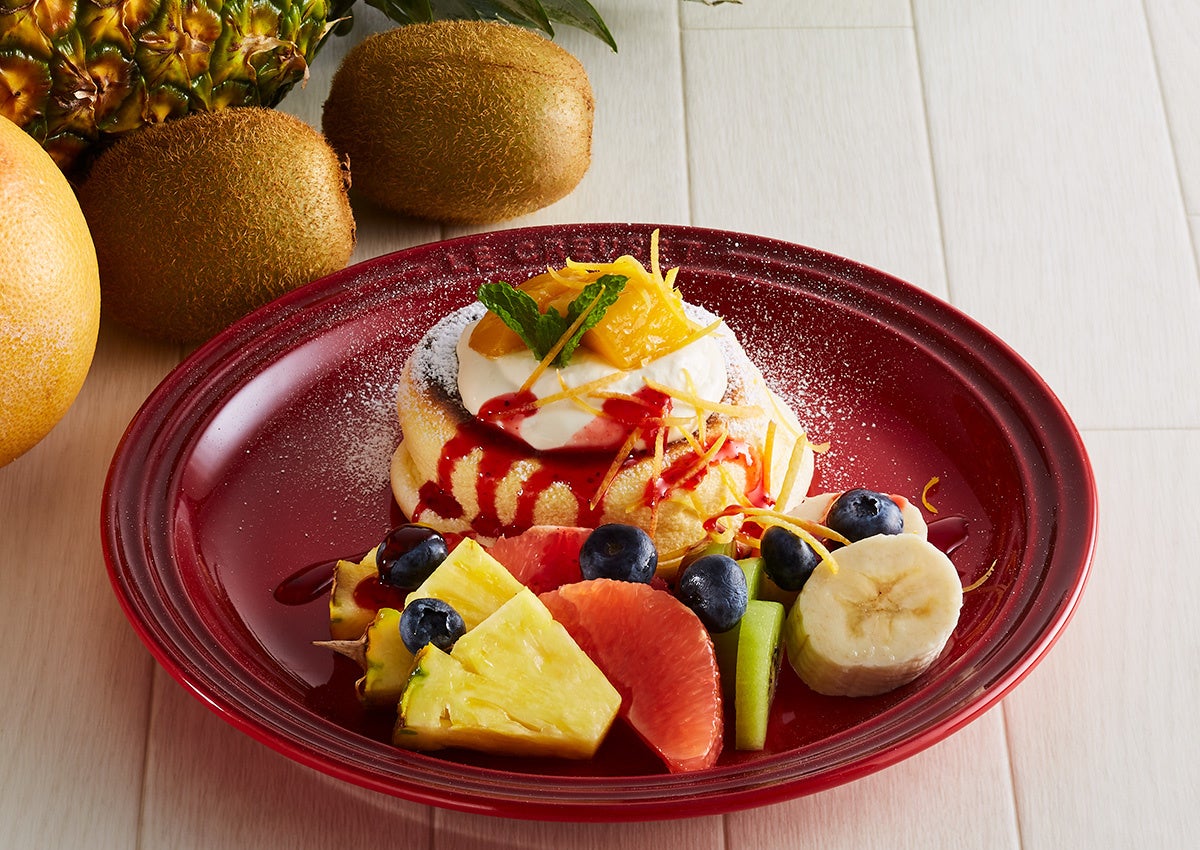 6種類のフルーツを贅沢に使用した夏らしく爽やかなフルーツパンケーキをご用意しました。たっぷりのフレッシュフルーツと優しい甘さのマンゴーホイップは相性抜群。嬉しいミニパフェ付きで色々な味わいがお楽しみいただけるパンケーキをご賞味ください。