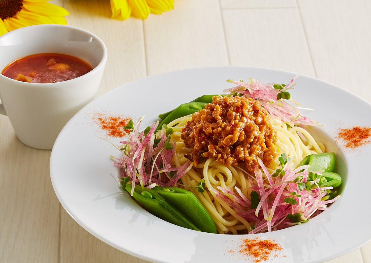 ブロッコリースプラウトやこうしん大根の彩りと香り豊かな花椒辣醤風味のヘルシーパスタをご用意しました。大豆ミートの概念が変わる絶品冷製パスタは、シェフおすすめの一品です。