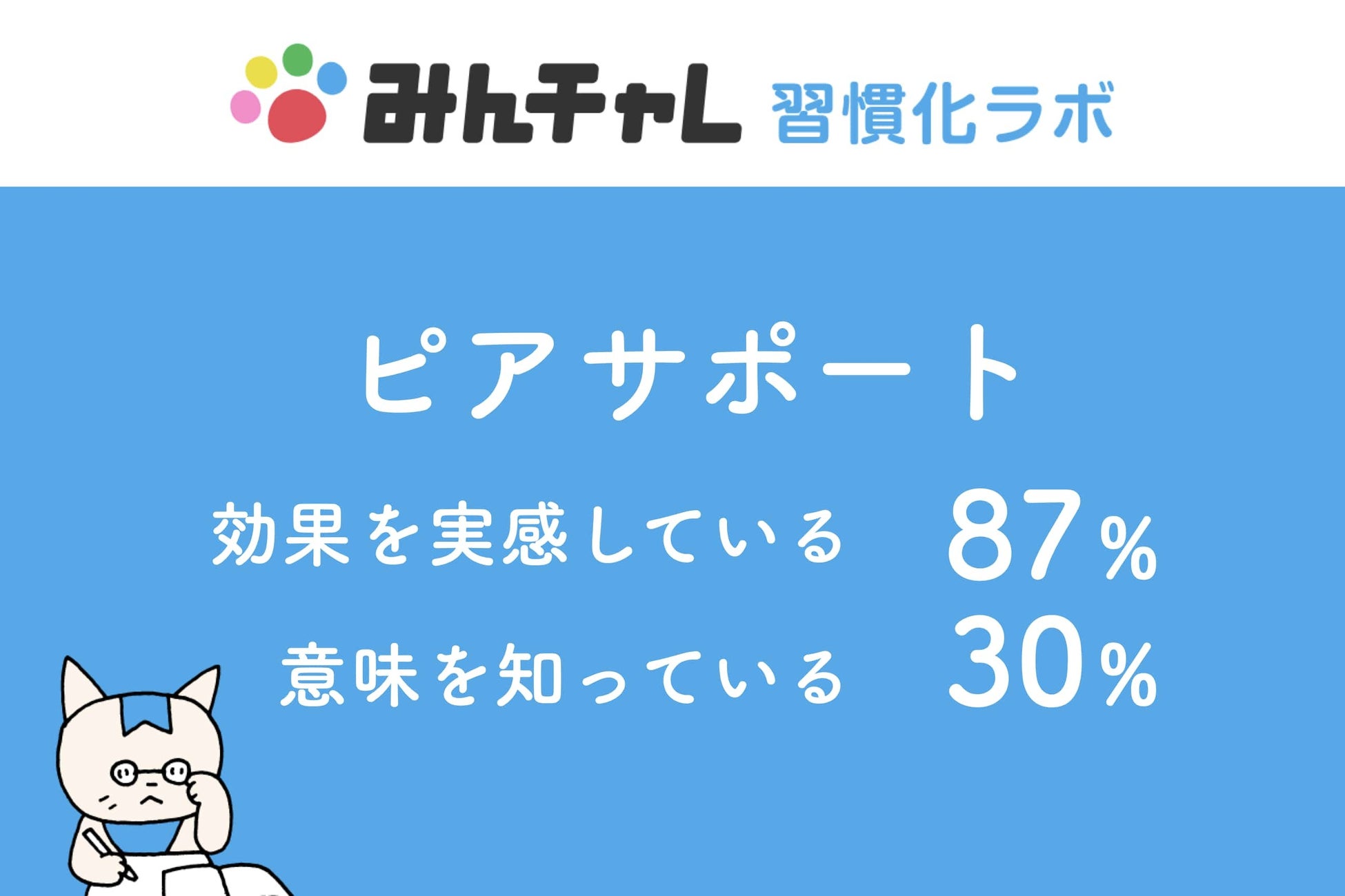 習慣化の成功に重要なピアサポートの認知度は約30%と低いものの、約87%のユーザーがピアサポートの支援効果を実際に感じており、モチベーション維持や心理的な支えとして機能していることが示されています。