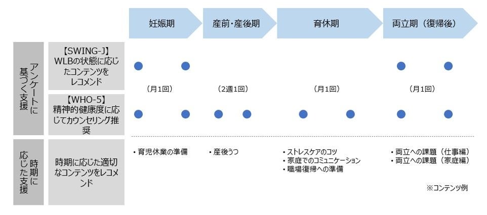 また妊娠期や育休中に生じるストレスへの対処や、スムーズな復職を心理面でサポートするコンテンツ等、育休を取得する従業員を適切なタイミングで支援するコンテンツを提供することで、妊娠期から育休期を経て職場復帰後に至るまで切れ目のないサポートを実現します。