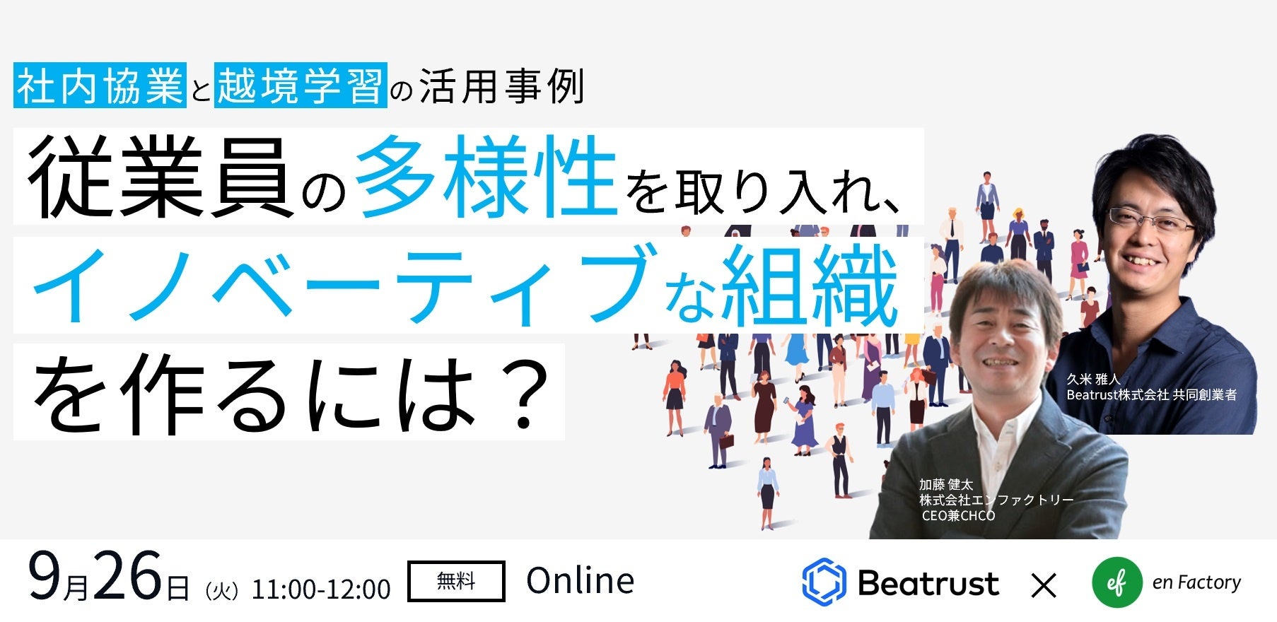 「従業員の多様性を取り入れ、イノベーティブな組織を作るには?〜社内協業と越境学習の活用事例〜」ウェビナーを、Beatrust株式会社とともに2023年9月26日(火)11:00-12:00に開催します
