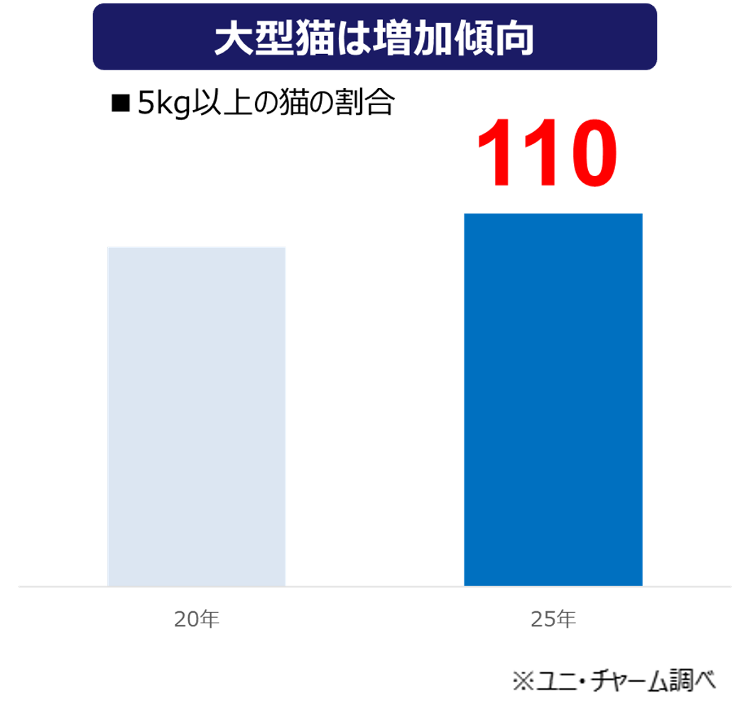 近年、メインクーンやラグドールといった大型種の人気から、愛猫の大型化傾向が強まっています。当社調査では、体重5kg以上の猫の割合は2020年比で約110%に増加しており、大型猫に適したトイレへのニーズが高まっています。一方、従来の大型トイレは「砂の全量交換に手間がかかる」という課題や、「飛び散り防止のために壁を高くすることで、視覚的な圧迫感が生じ、飼い主様が使いづらそうと感じる」といった課題がありました。