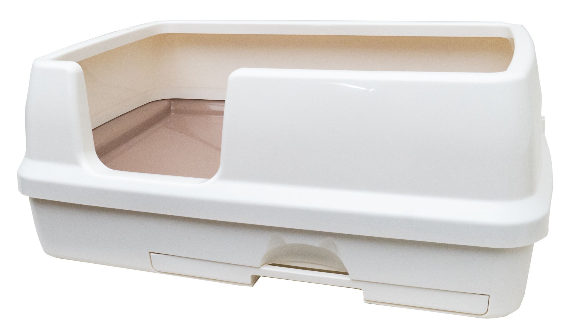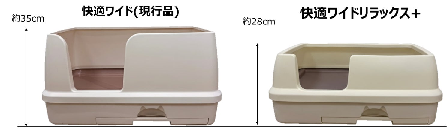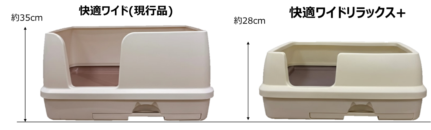 ・広々とした排泄スペースはそのままに、側面の壁の高さを従来品の約35cmから約28cmへと低く設計しました。大型の猫が周囲を見渡せる開放的な空間を実現しています。