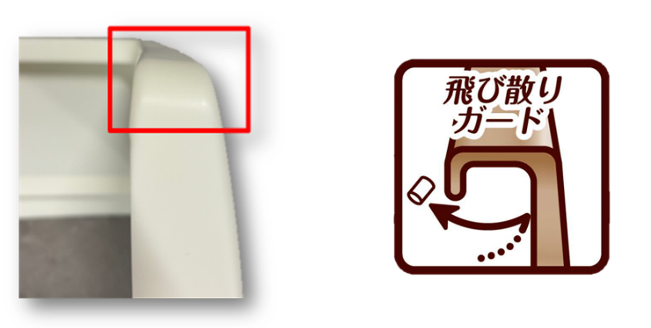 ・壁上部に独自の「折り返し構造」を設けることで、猫ちゃんが砂をかいた際のサンドの飛び散りを効果的にガードし、周囲への飛び散りを抑制します。