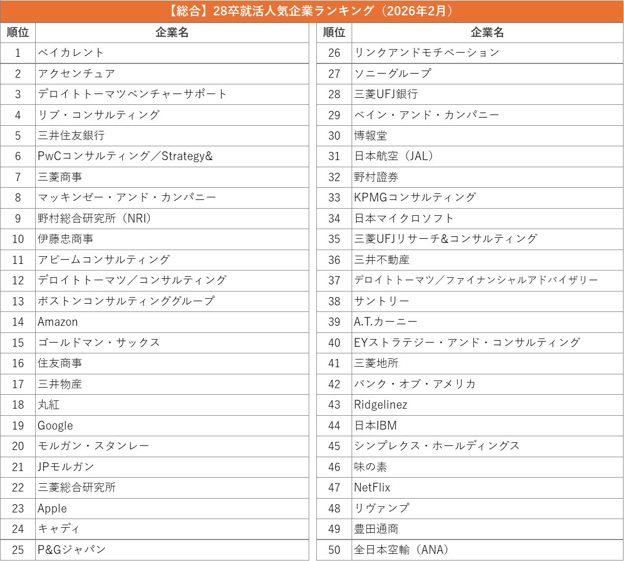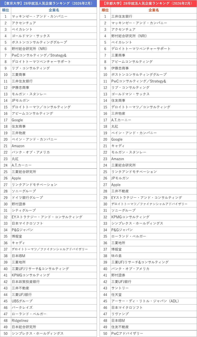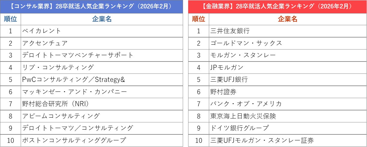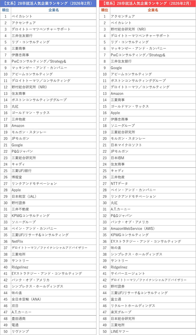 外資就活総合研究所、外資就活ドットコム利用学生対象の「2028年卒 就活人気企業ランキング(2026年2月)」を発表