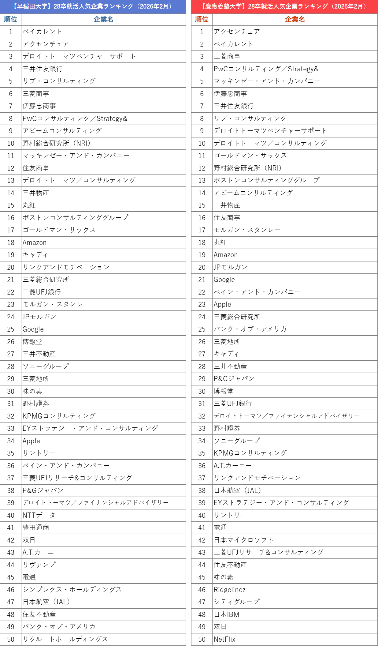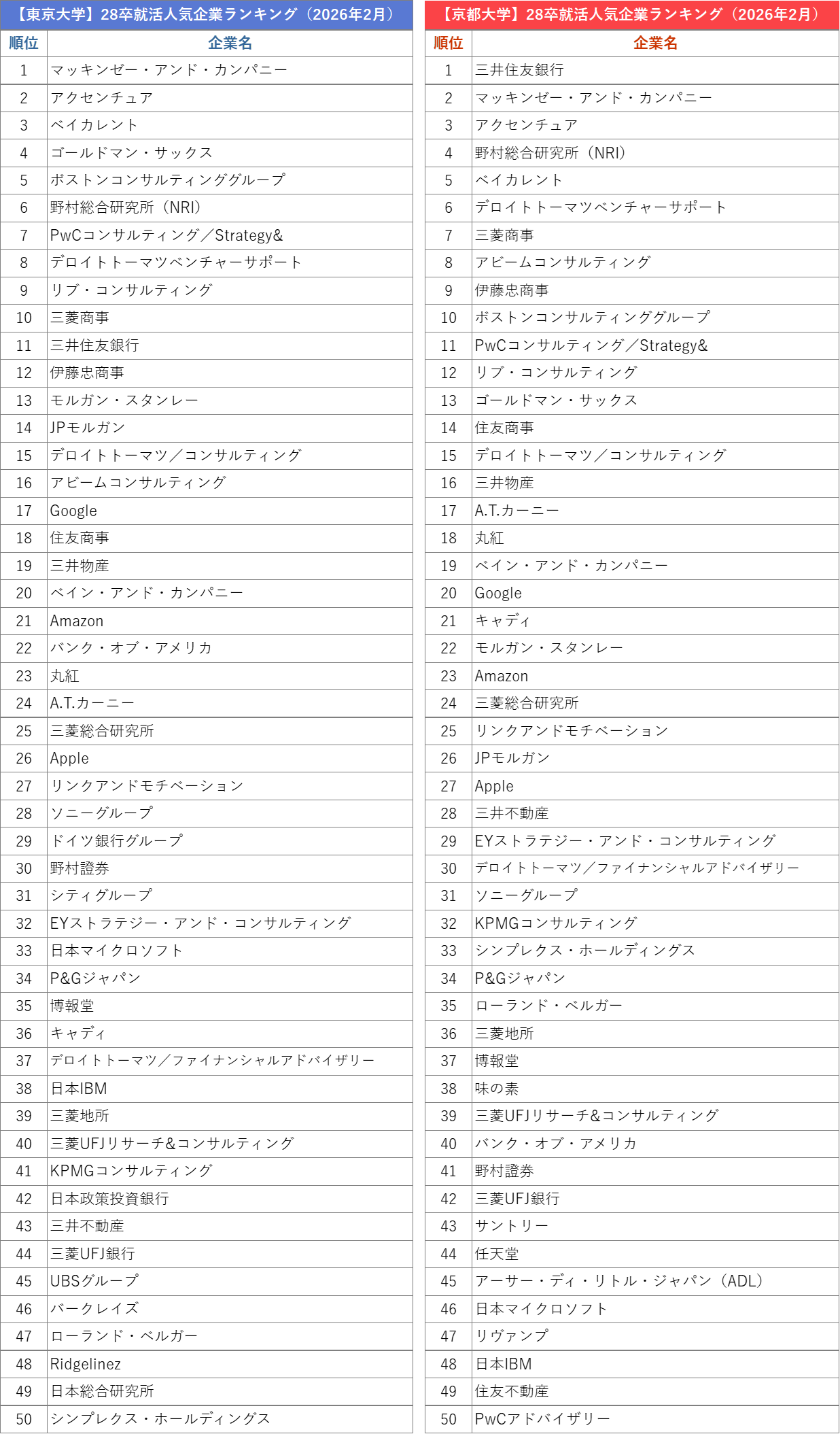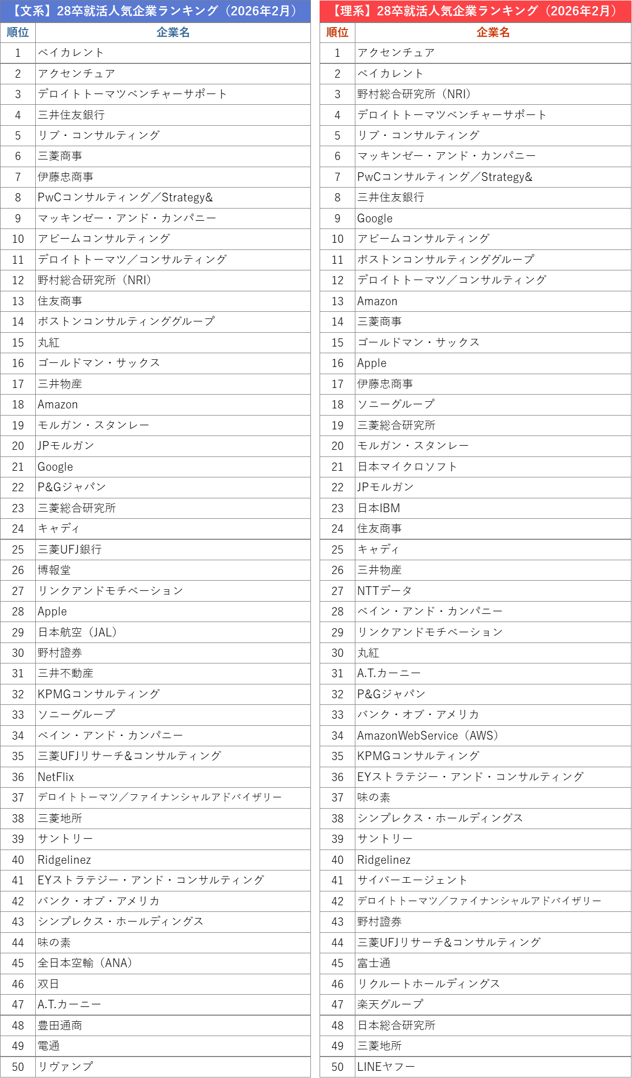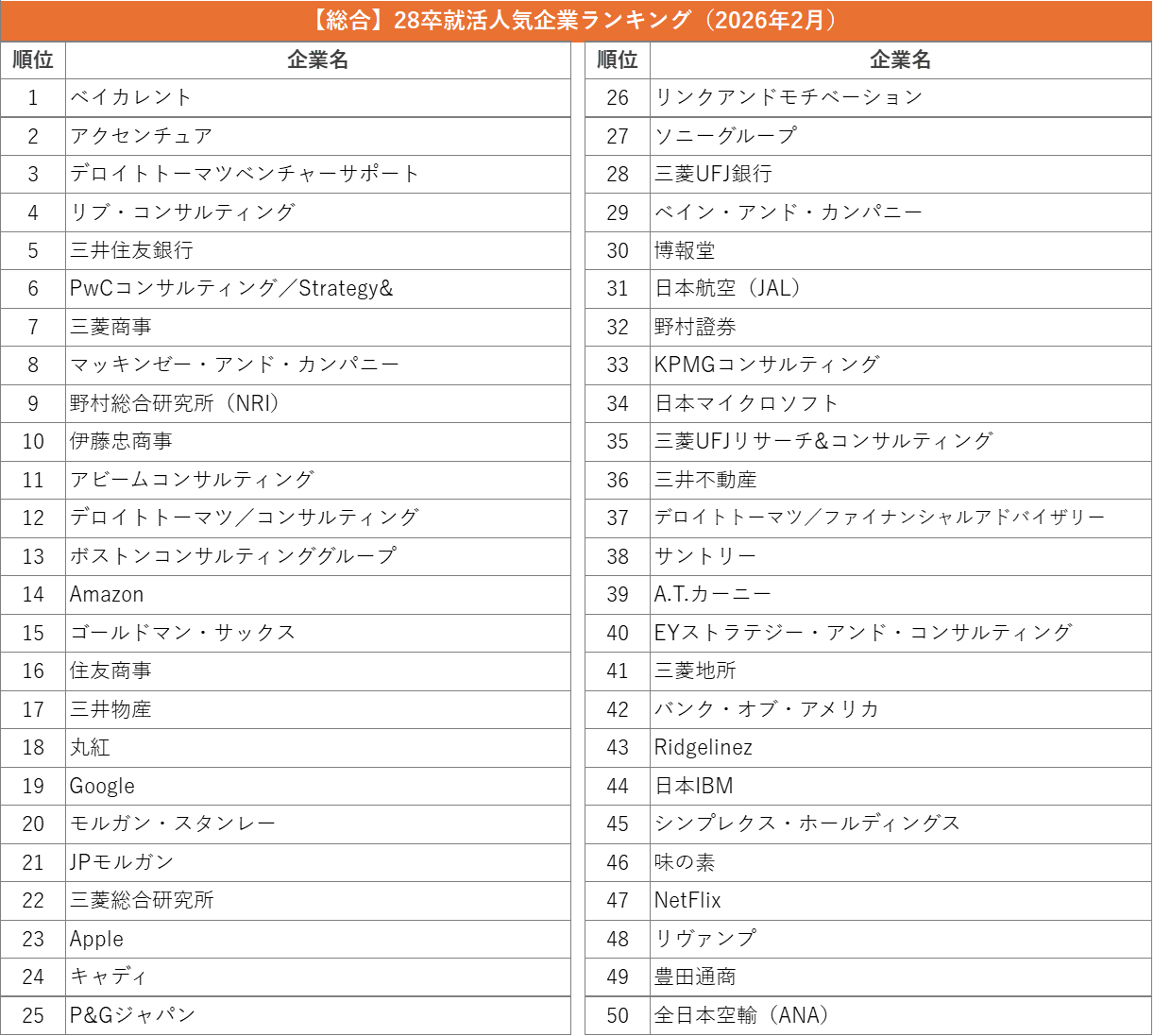 外資就活総合研究所、外資就活ドットコム利用学生対象の「2028年卒 就活人気企業ランキング(2026年2月)」を発表