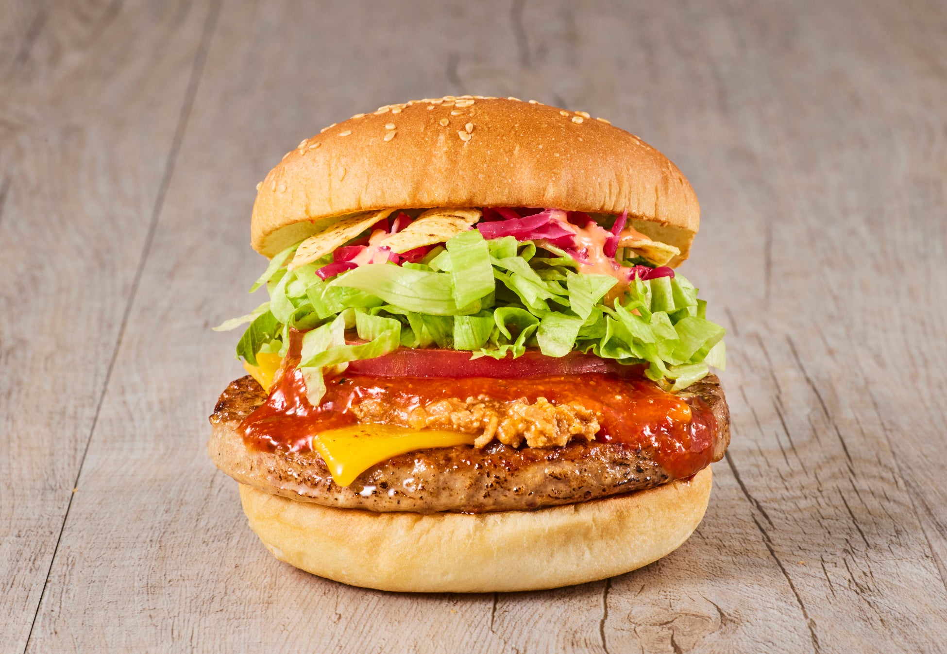 沖縄ソウルフードのタコライスをハンバーガーで再現。肉厚ジューシーなプレミアムビーフパティと、たっぷりの国産生野菜をサンド。彩り鮮やかな紫キャベツマリネとパリパリ食感のトルティーヤチップスをトッピングしました。スパイシーでコク深い特製タコミートに島唐辛子の旨辛ホットソースを合わせることで、より濃厚で刺激的な味わいに。やみつきになる一品です。