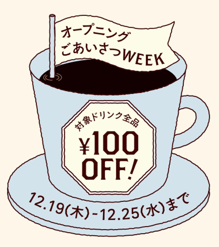 12月19日(木)〜12月25日(水)は対象ドリンクが全品100円引きの特別週間。中煎りのブレンドを使用したフルーティーなカフェラテなど猿田彦珈琲の人気定番メニューで皆様をお迎えいたします。