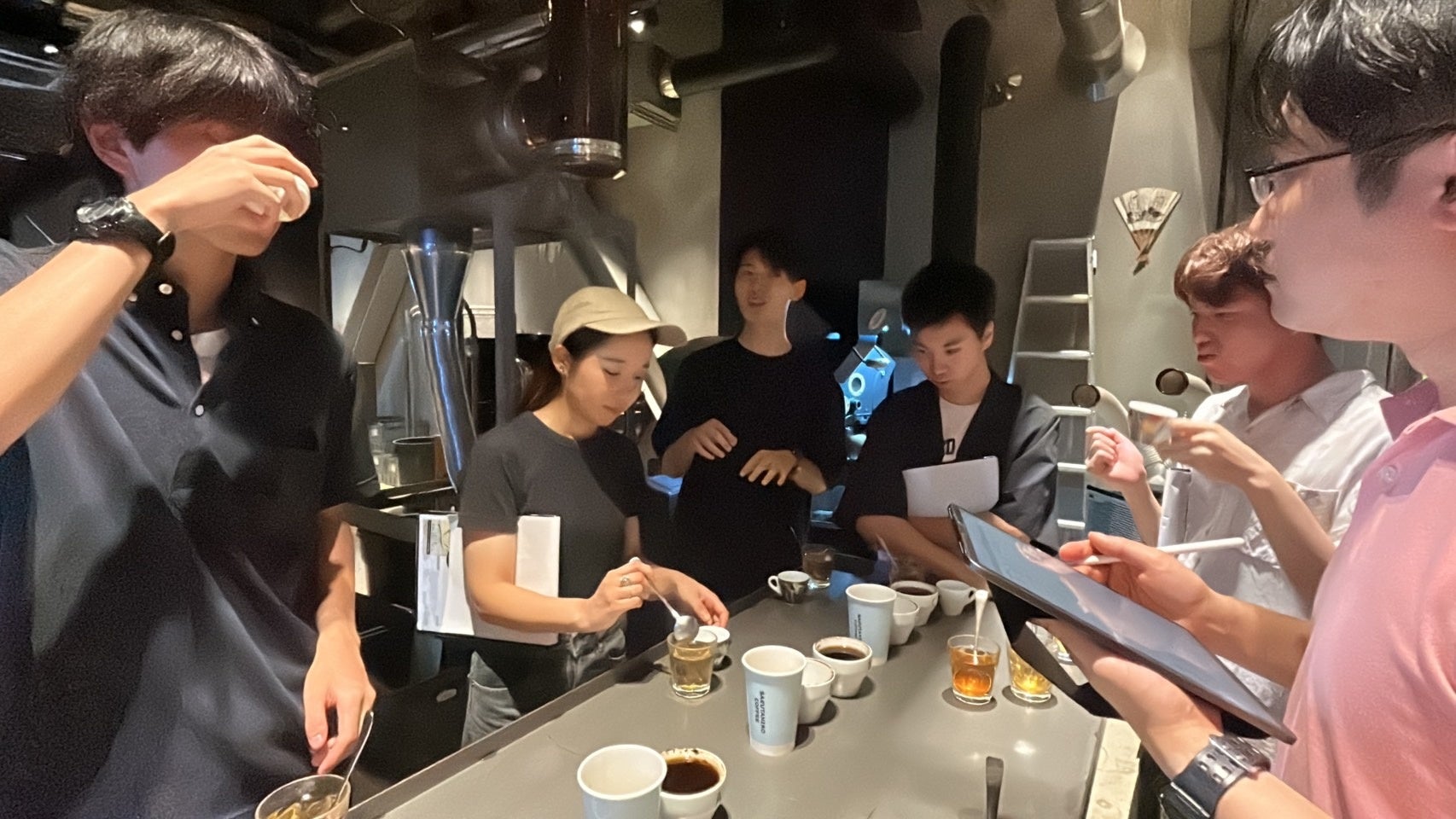 1ヶ月後、今度は珈琲研究会の皆さんを猿田彦珈琲 調布焙煎ホールにご招待し、店舗の説明や焙煎の風景などを見学していただいた後、駒澤大学でヒアリングした駒澤ブレンドのサンプル、数種類を一緒にテイスティング。細かい味わいについて意見交換し、今回発売する駒澤ブレンドの方向性を決定していきました。
