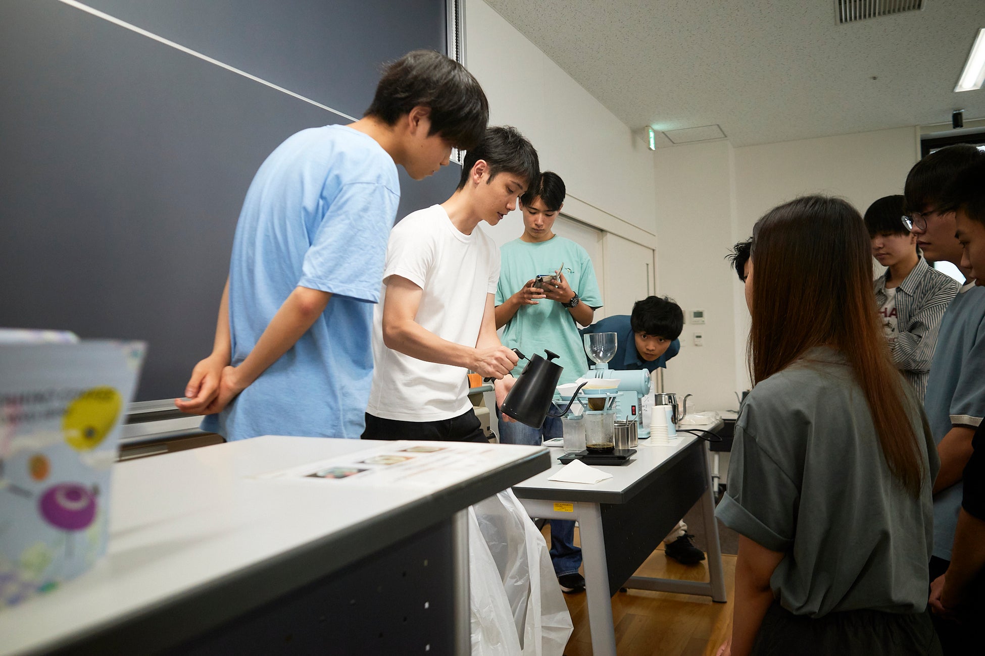 駒澤大学駅に新店舗をオープンするにあたり、地域の皆様により親しみやすい店舗にしたく、特別なブレンドコーヒーを作りたいと思う中、「駒澤大学珈琲研究会」というサークルがあることを知りました。もし駒澤大学の学生と一緒にブレンドを作れたら、今までにはない新しい学びがあるのではないか?学生の皆さんにも何か還元できるのではないか?という思いでコンタクトを取りました。まず猿田彦珈琲が駒澤大学に行き、会社の説明や猿田彦珈琲のコーヒーの試飲、コーヒーの淹れ方のデモンストレーションなど自己紹介をさせていただくと共に、大学生のみんなはどんなコーヒーの味わいが好きなのか、どんなときにカフェを利用するのか、など直接コミュニケーションを取り意見交換をしました。
