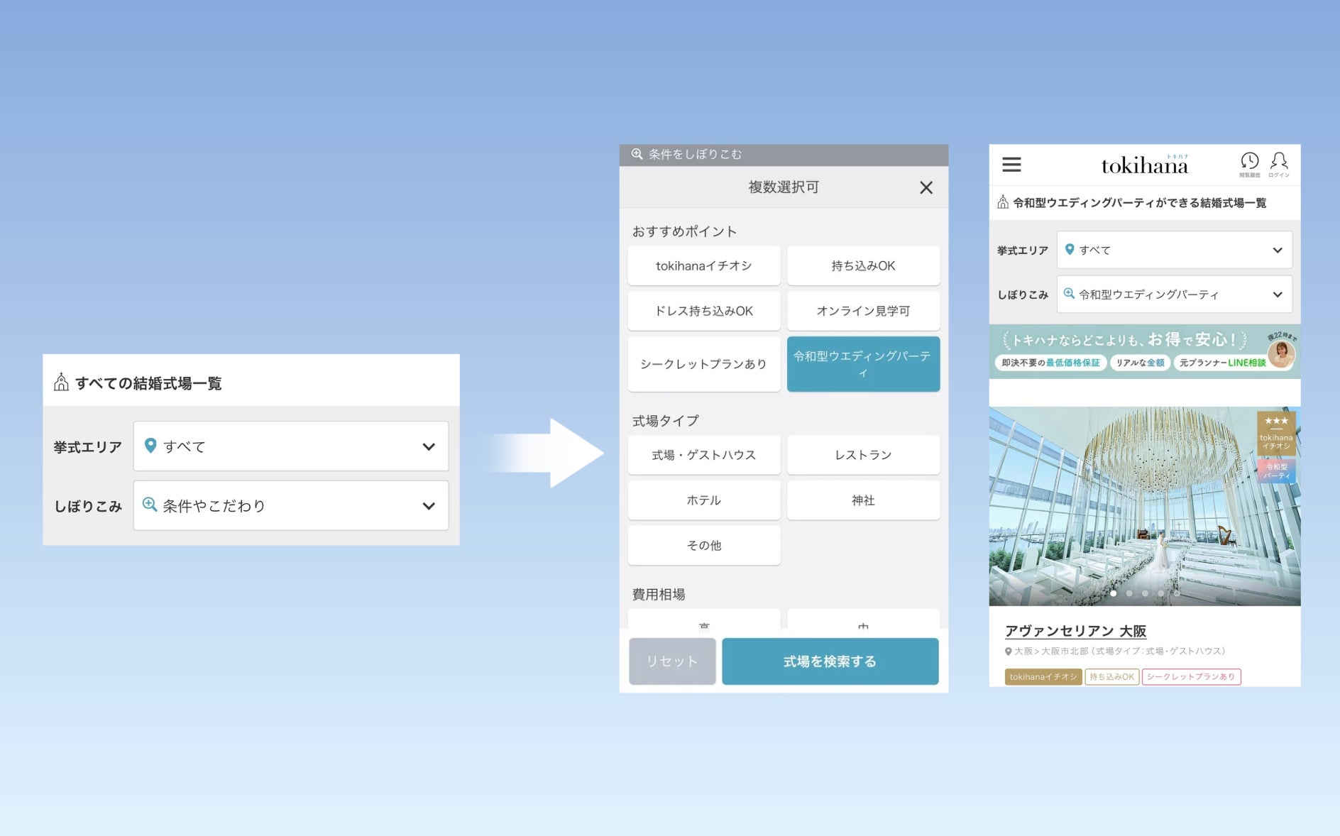 トキハナの式場検索ページにおいて「おすすめポイント」内に「令和型ウェディングパーティ」タグを新設。