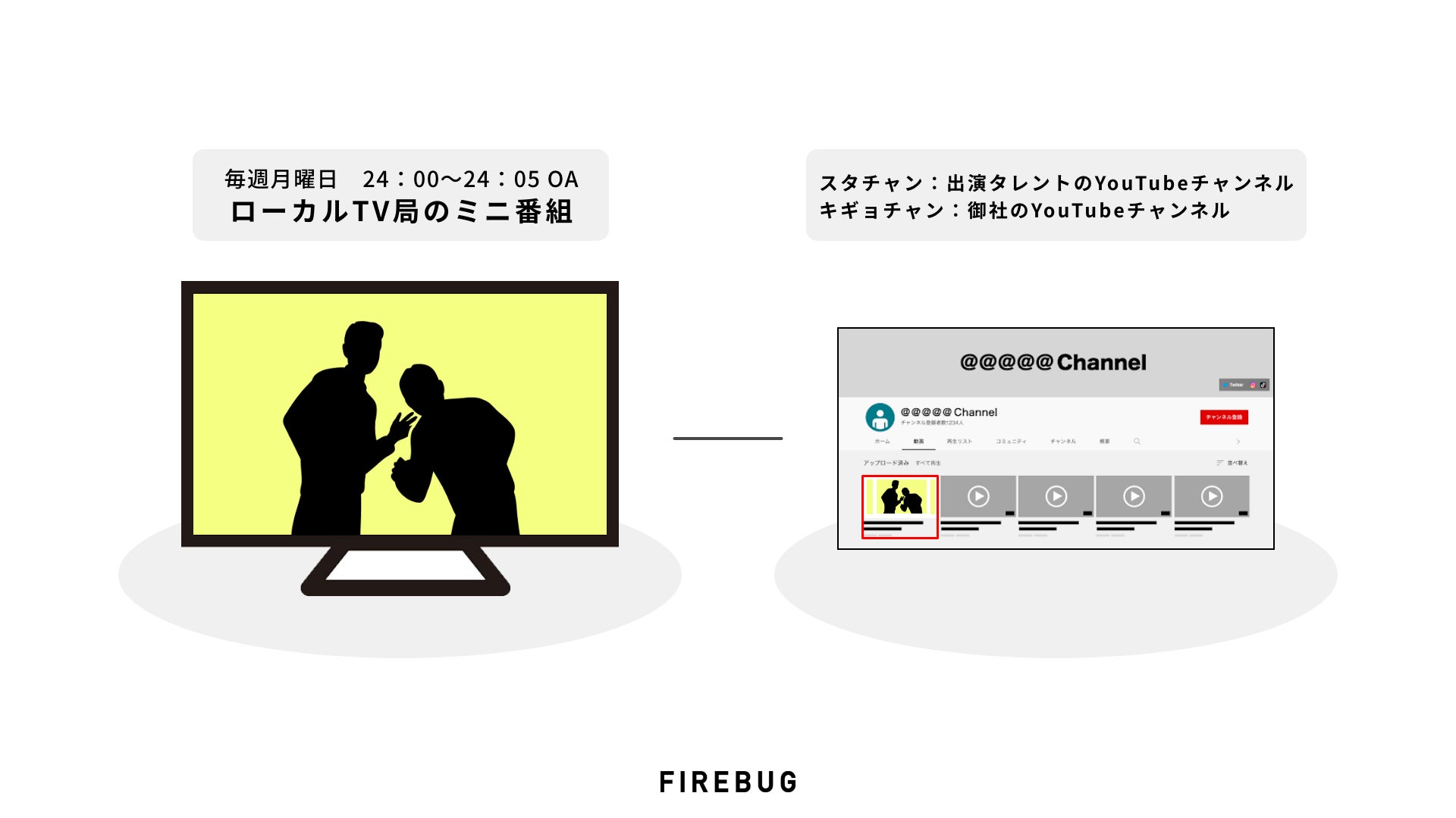 ローカルTV局のミニ枠(5〜10分)の番組を制作し、地上波放送後に企業のYouTubeチャンネルで配信するパッケージ。