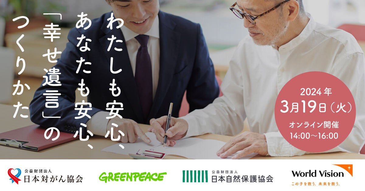 日本自然保護協会は、2024年3月19日(火)にオンライン終活セミナー「わたしも安心、あなたも安心 幸せ遺言のつくり方」を開催します(参加無料)。