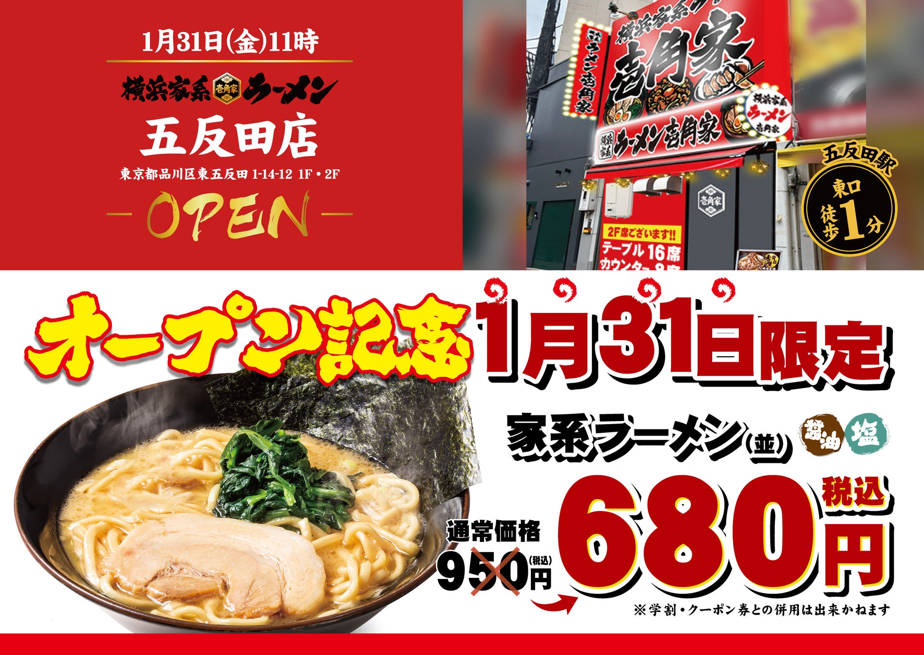 「壱角家 五反田店」は五反田駅から徒歩2分の場所に位置し、駅からの視認性も良く、歩道橋を渡ってすぐの好立地にオープンします。五反田駅周辺は、ITベンチャー企業を中心としたオフィス街や商業施設が集う繁華街・歓楽街として栄え、都市再開発によるタワーマンション群をはじめ高級住宅街の池田山などもあり、東京23区南部の中心地です。昼はサラリーマンの方に、夜は飲み会終わりの締めのラーメンとして、オフィスワーカーや壱角家を利用した事がない幅広い層の多くの方々にご利用いただけるよう、ランチから翌朝までスタッフ一同心を込めて営業してまいります。