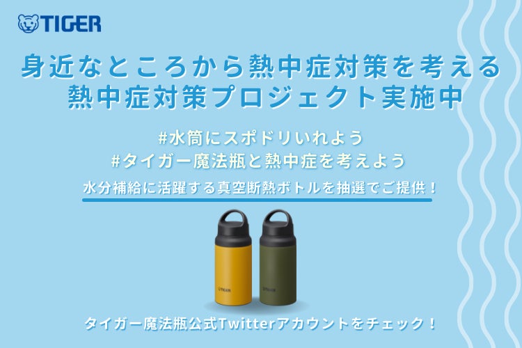こうした状況を受け、手早く塩分・糖分を一緒に補給できるスポーツドリンクの携帯を呼びかける「#水筒にスポドリいれよう キャンペーン」と、熱中症に関する情報の発信・啓発を行い、ユーザーの方に参加型で学んでいただく「#タイガー魔法瓶と熱中症を考えよう キャンペーン」をタイガー魔法瓶公式Twitterアカウント(@Tiger_PR_JPN)から発信してまいります。