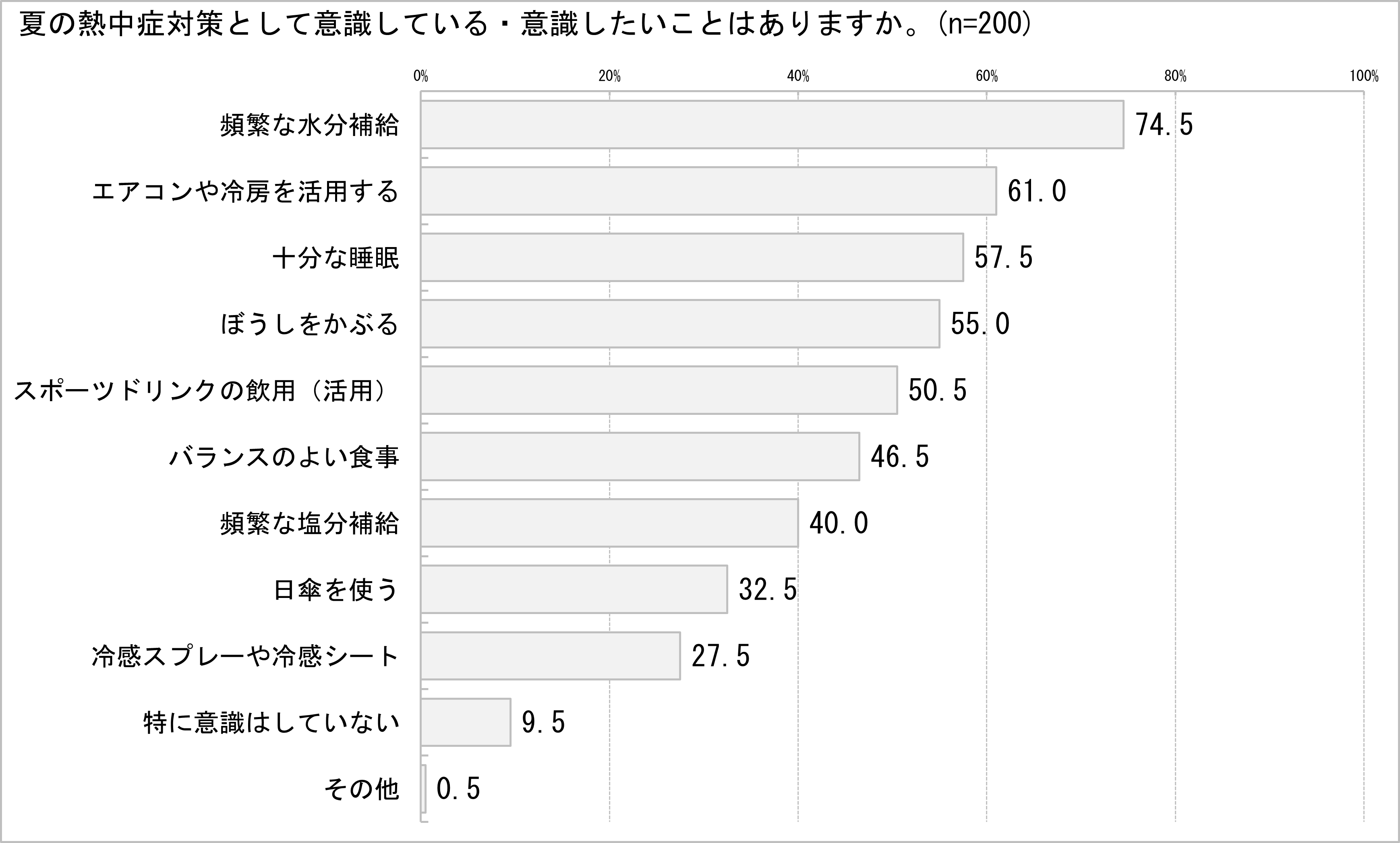 また、「夏の熱中症対策として意識している・意識したいこと」を質問したところ「頻繁な水分補給」が74.5%、「スポーツドリンクの飲用(活用)」が50.5%という結果に。(※1) 熱中症対策としてこまめな水分補給を心がけている方が項目の中では最も多く、2人に1人の方がスポーツドリンクの飲用を意識していることがわかりました。