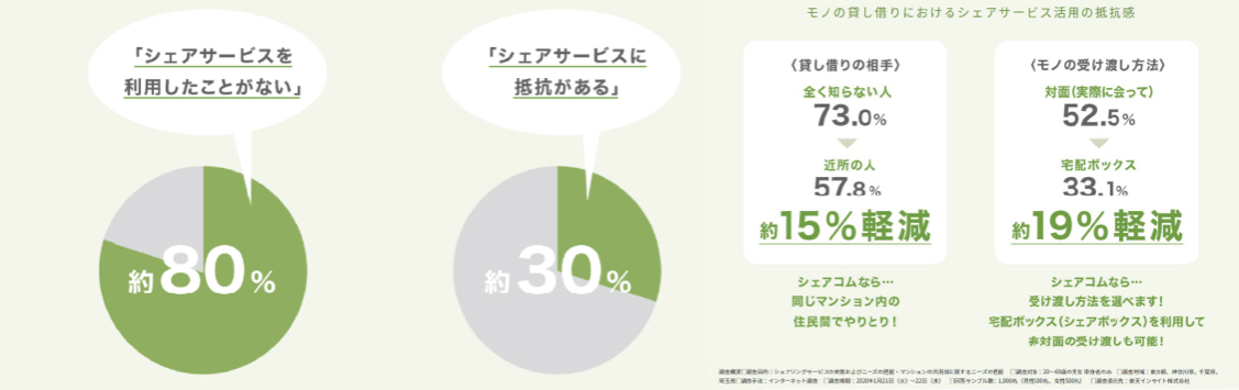 「シェアコム」は、「+ONE LIFE LAB(プラスワンライフラボ)」の男女1,000人を対象に実施した「マンションにおける共用部・シェアリングサービス調査」の主な調査結果から、シェアリングサービスに対しての抵抗感などが少ないことや、住民間でのやり取りであれば軽減されることからシェアリングサービスに着目し、誕生したサービスとなります。