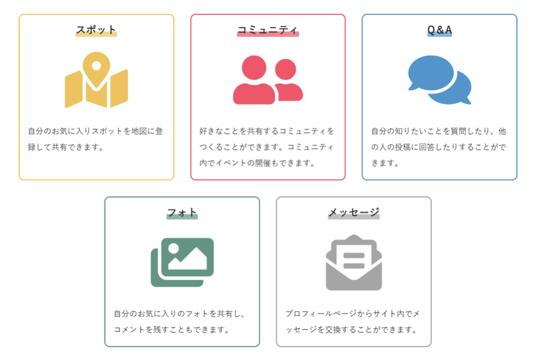 身近なおすすめスポットを共有できる「スポット」機能、マンション内のコミュニティ形成に活用できる「コミュニティ」機能、マンション住民に気軽に質問できる「Q&A」、お気に入りの写真を気軽に共有できる「アルバム」機能、気軽にサイト内での連絡が可能な「メッセージ」機能を備え、住民間コミュニケーションの更なる活性化を図ります。