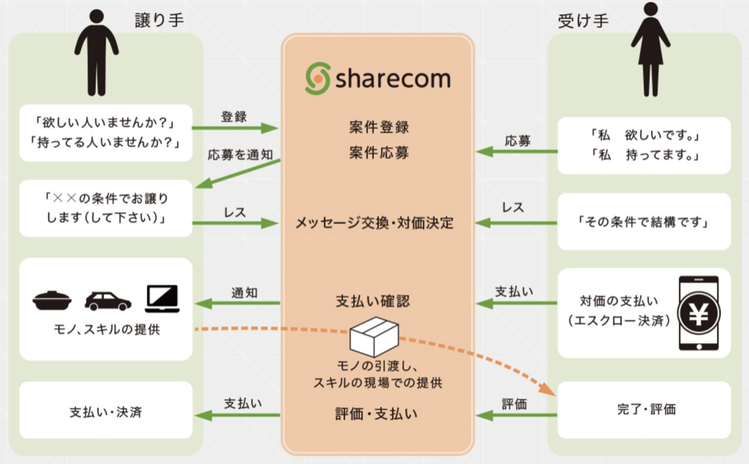 「シェアコム」は、同じマンションの住民に対し利用したい「モノ」や「スキル」の募集をし、募集に合致する人がいるとマッチングしエスクロー決済にて対価の支払いをするというシステムです。また、受け手側同様、「モノ」や「スキル」を提供したい人も募集が可能です。