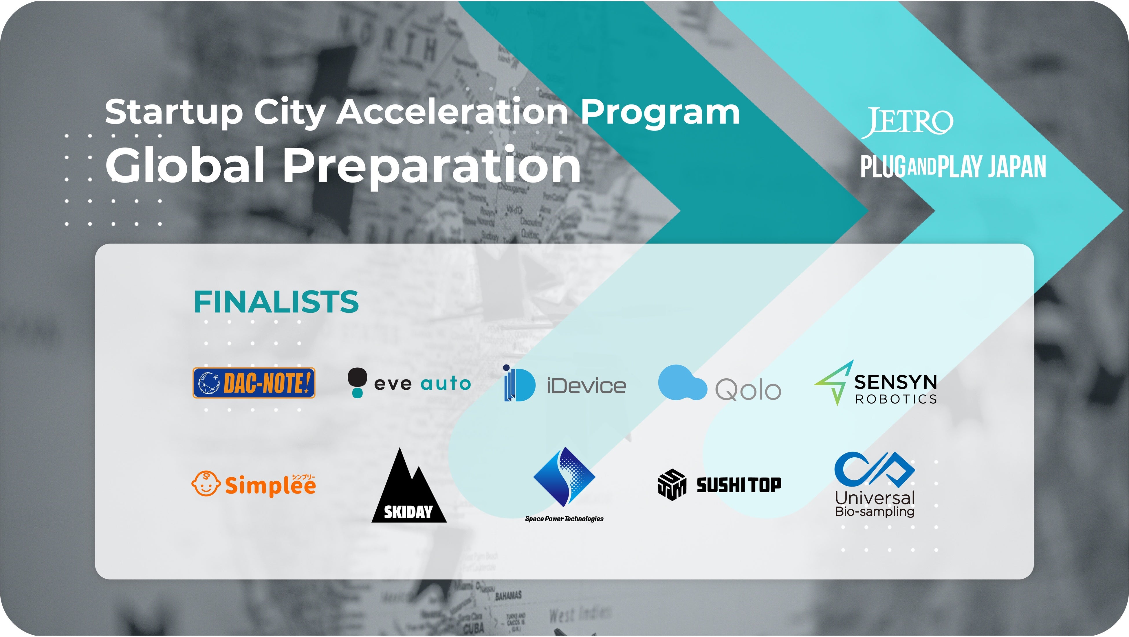 Plug and Play Japan株式会社(本社:東京都渋谷区、代表取締役社長:ヴィンセント・フィリップ、以下「Plug and Play Japan」)は、独立行政法人日本貿易振興機構(東京都港区、理事長:佐々木伸彦、以下「JETRO」)との連携によるスタートアップ向け海外展開支援プログラム「スタートアップシティ・アクセラレーションプログラム『Global Preparationコース』」の最終フェーズを通過したファイナリスト10社を決定したことをお知らせいたします。