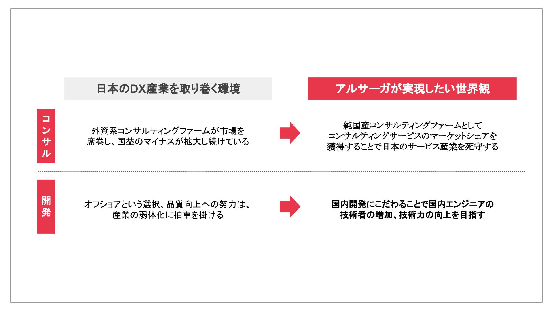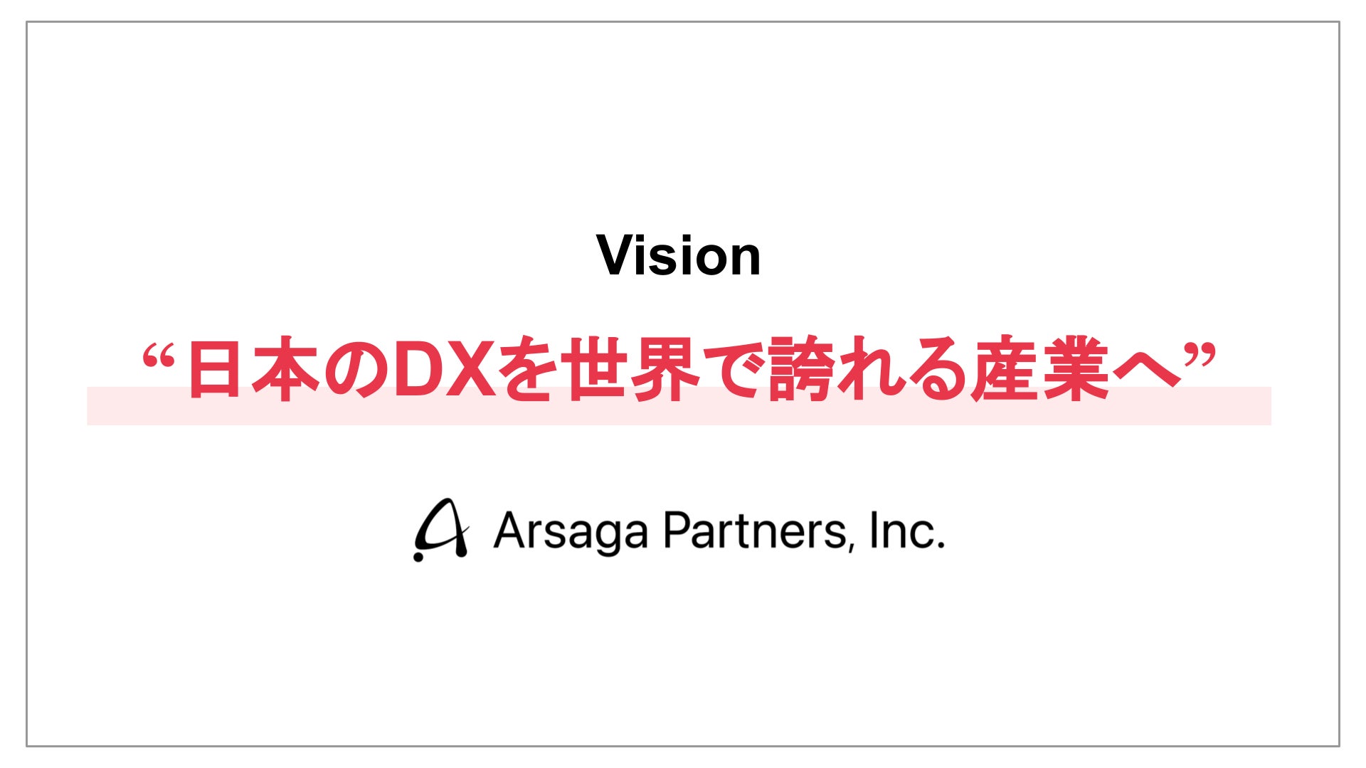 新しいビジョンは「日本のDXを世界で誇れる産業へ」です。これは、コンサルティング、システム開発の両方の機能を持つ総合ファームに生まれ変わったアルサーガパートナーズが日本のDXサービスを世界に誇れる産業に導くことへの意思表示です。