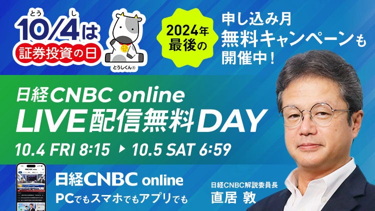 10月4日の「証券投資の日」は、日経CNBCの有料インターネット配信サービス「日経CNBC online」(月額1650円/税込)のライブ配信を無料開放いたします。
