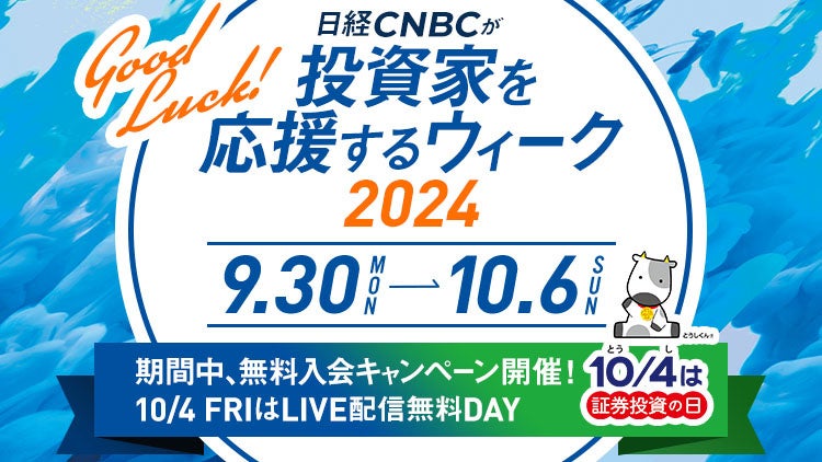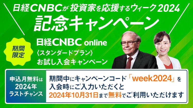 「投資家を応援するウィーク2024」では有料インターネット配信サービス「日経CNBC online」への入会を検討中の皆様に向け10月末までの視聴料が無料となるキャンペーンを用意しております。本イベントをきっかけに「日経CNBC online」をお試しください!