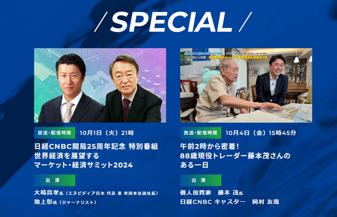 レギュラー番組「朝エクスプレス」と「昼エクスプレス」のほか、米エヌビディア日本代表・大崎真孝氏とジャーナリスト・池上彰氏が出演する「開局25周年記念 特別番組 世界経済を展望するマーケット・経済サミット2024」や、著名個人投資家・藤本茂氏(シゲルさん)に密着した「午前2時から密着! 88歳現役トレーダー藤本茂さんのある一日」などの特別番組、「米雇用統計LIVE解説」などのインターネット限定番組を通じて「投資でいかに資産を増やすか」を掘り下げます。