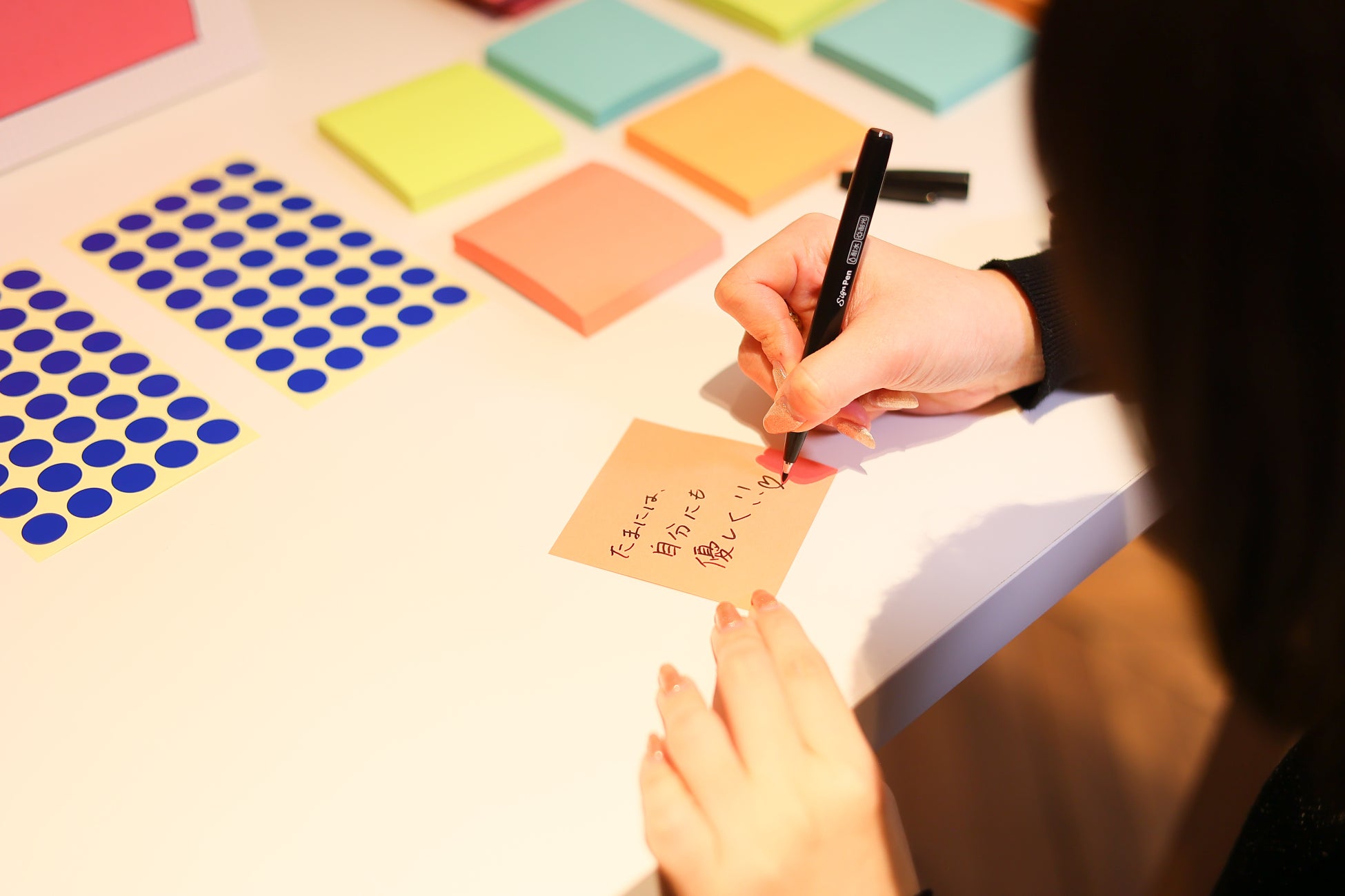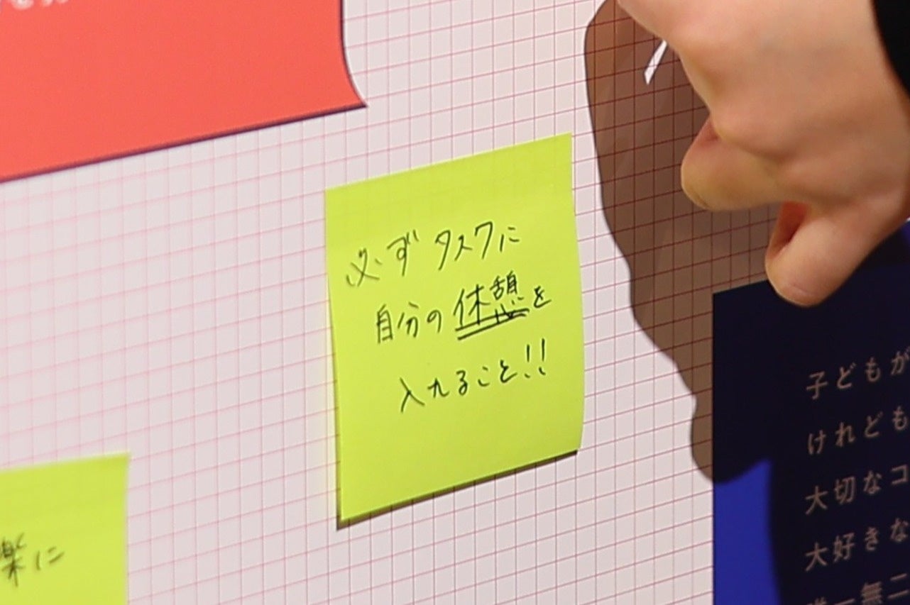 会場内には、訪れた方も自分が実践している両立の工夫やヒント、自分自身や周囲のワーママへのエールを自由に書き込めるスペースも設置しました。「力を抜いて」「完璧でなくていい」といった労いや、自分の時間を持つことの大切さを伝える声、そして、今は大変でも子どもが成長するとママの生活も変わっていく、というママ本人の経験を踏まえた励ましの言葉が集まりました。