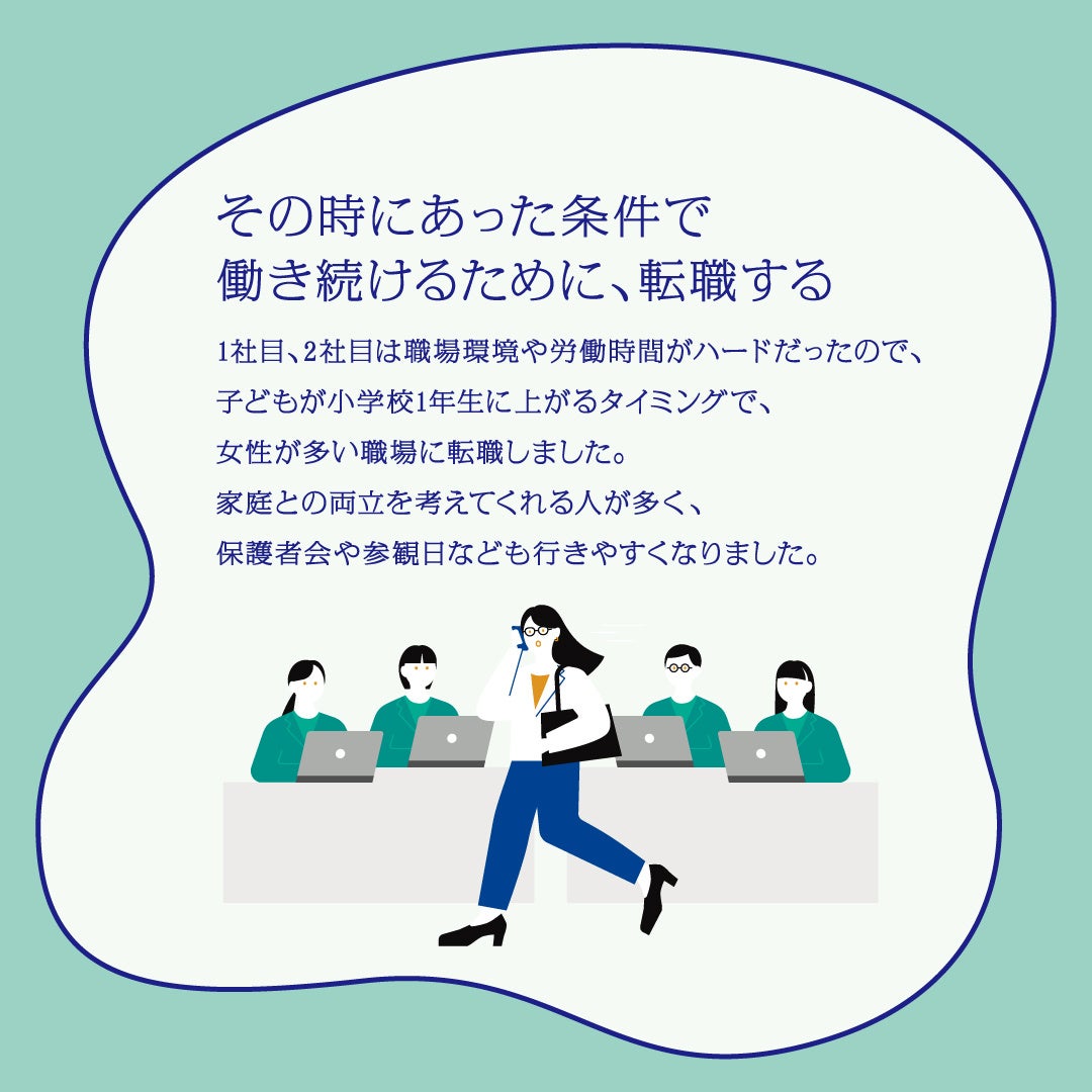 1社目、2社目は職場環境や労働時間がハードだったので、子どもが小学校1年に上がるタイミングで、女性が多い職場に転職しました。家庭との両立を考えてくれる人が多く、保護者会や参観日なども行きやすくなりました。(小学2年生 /デザイン会社勤務 デザイナー/フルタイム勤務 /リモート)
