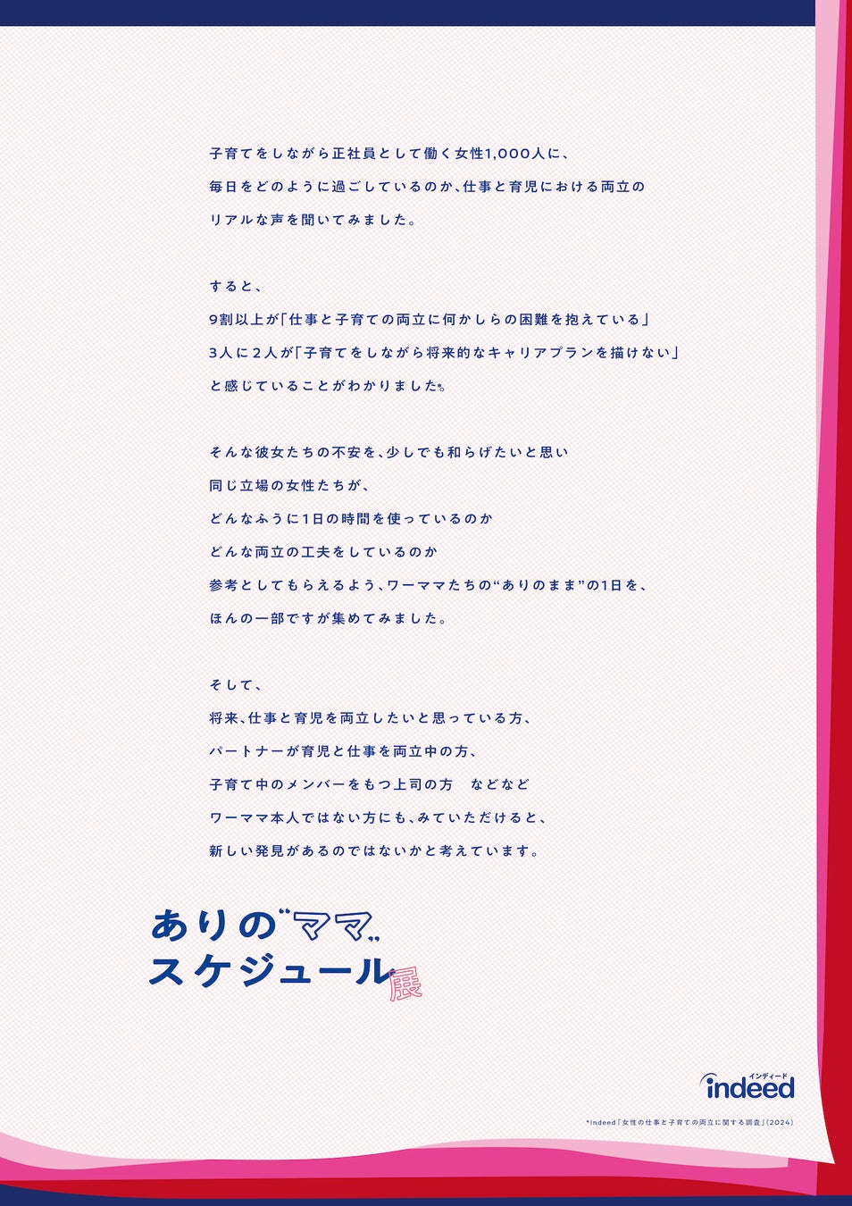 Indeedは、国際女性デーを前に1,000人の正社員ワーママを対象として「女性の仕事と子育ての両立に関する調査」(詳細は6ページ以降に記載)を実施しました。その結果、正社員ワーママの9割以上(92.2%)が「仕事と子育ての両立に何かしらの困難」を抱えており、3人に2人(66.5%)が「将来のキャリアプランの見通しを持てない」と考えていることがわかりました。本イベントは、これらの声をもとに開催することにしたもので、さまざまな立場にあるワ―ママの、ありのままのリアルなスケジュールと両立の工夫を展示することで、仕事と子育ての両立に悩む方々に、日々の過ごし方の参考にしていただくとともに、将来の見通しを立てたり今後のキャリアプランを考えたりするきっかけとしていただきたいと考えています。